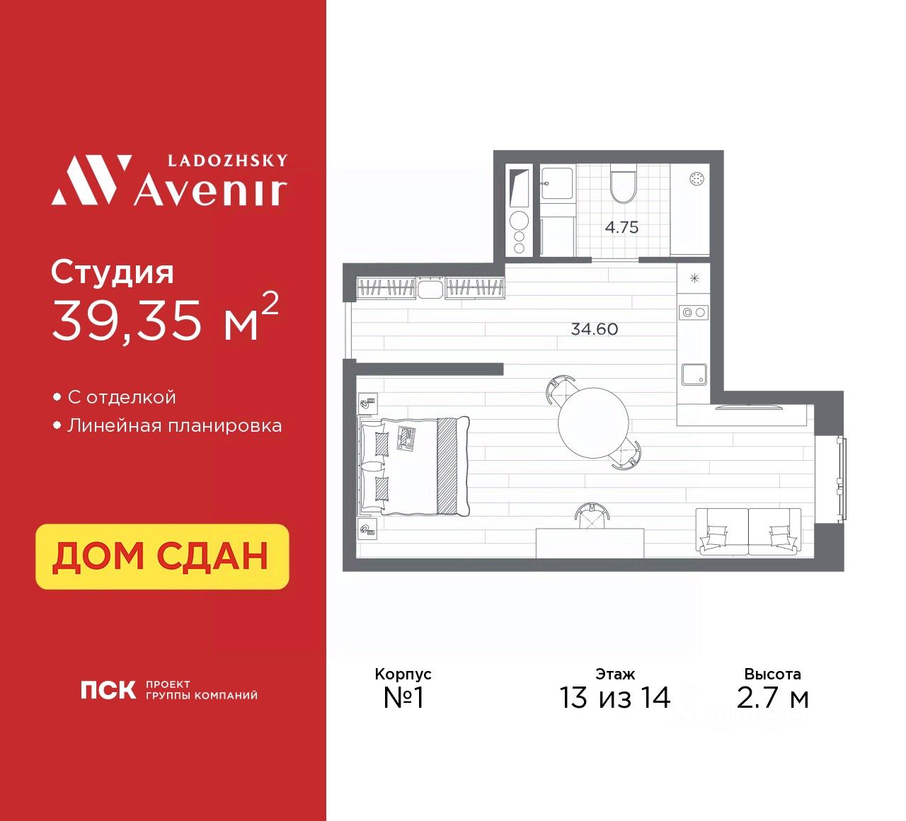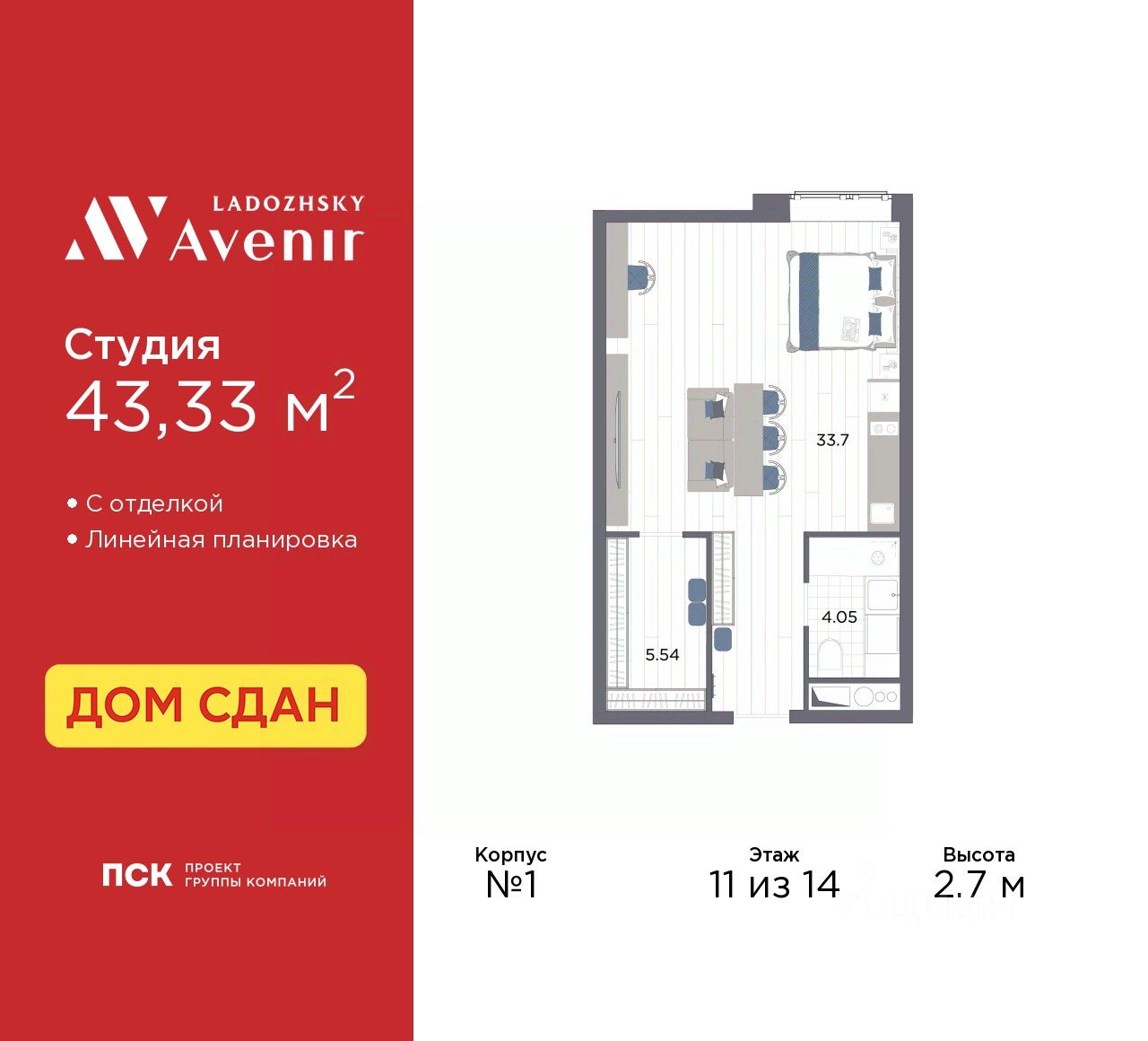 Продаются однокомнатные апартаменты-студия с отделкой в ЖК ''Ladozhsky AVENIR'' на 6 этаже. Общая площадь: 28.08 кв.м., площадь гостиной 24.03 кв.м., из которых 5 кв.м. выделено под кухонную зону. Все окна выходят на одну сторону. В апартаментах один совмещенный санузел. Высота потолков 2.7 м. Апартаменты находятся в корпусе 1. Дом монолитный, одноподъездный, высотой 14 этажей. На этаже 50 квартир. В подъезде 4 пассажирских и 4 грузовых лифта. В шаговой доступности от дома находятся станции метро (расстояние по прямой): ''Ладожская'' (800 м), ''Новочеркасская'' (1.7 км), также недалеко от этого корпуса расположены станции метро: ''Площадь Александра Невского'', ''Чернышевская'', ''Площадь Восстания''. Тест-драйв в готовых апартаментах. Перед покупкой можно арендовать номер для проживания с компенсацией от застройщика. Ladozhsky AVENIR — апартотель бизнескласса в историческом районе Матросская слобода на Правобережье Невы в 10 минутах пешком от станции метро ''Ладожская'' и 10 минутах на автомобиле до Невского проспекта. Апартотель Ladozhsky AVENIR — четвертый проект сети сервисных апартотелей AVENIR и первый мультиформатный проект, включающий в себя апартаменты, офисы и коммерческие помещения. Относится к высокому сегменту ''Бизнес - класс'' Все апартаменты сдаются с отделкой ''под ключ'' в единой стилистике. Семейная ипотека на апартаменты не распространяется. Деятельность по сдаче апартаментов в аренду осуществляет управляющая компания PSK INVEST, входящая в группу компаний ''ПСК''. Для передачи апартамента в управление PSK IINVEST необходимо заключить договор на приобретение пакета ''Меблировка и оснащение''. Аккредитация в банках: ПАО ''Банк Уралсиб'', ПАО Банк ''ВТБ'', ''Сбербанк России'', ПАО АКБ ''Абсолют Банк'', ПАО Банк ''ФК Открытие'' и других. #ZWCFzW