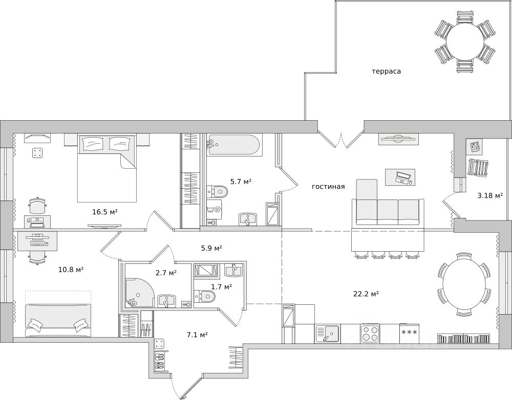 Арт. 117689427 Квартира с тремя спальнями в новом доме бизнес-класса у метро ''Черная речка''. Оптимальное соотношение площади, количества комнат, уровня ремонта и локации! Основные характеристики квартиры: Общая площадь 83 м2 Кухня-гостиная 26,3 м2 Спальня с гардеробной 17,1 м2 Детская комната 15,8 м2 Детская или кабинет 12,5 м2 Два санузла с душевой кабиной и ванной Гардеробная с постирочной 3 м2 Лоджия 3,3 м2 Чтобы не потерять - добавьте в избранное или отправьте тому, кого эта квартира может сделать счастливым! Квартира полностью меблирована и оборудована всей необходимой для современной жизни техникой. В том числе кондиционерами. Высокий этаж с видом на Лахта-центр и перспективу города. Благодаря большим окнам, квартира действительно очень светлая. Квартира расположена в квартале ''ЦДС Черная речка''. Это новый современный микро-район со всей необходимой инфраструктурой в 10 минутах езды от центра города. Ухоженная территория, современные фасады, красивые входные группы. Много коммерции, есть все, что необходимо - от кафешек до супермаркетов, детских развивашек, салонов красоты, зоомагазинов и прочего. Все это в радиусе 5 минут пешком! Дворы закрыты от машин и посторонних людей. В них есть детские площадки, зоны отдыха и спортивные площадки, что важно для семей с детьми. На территории комплекса своя школа и детский сад. Вы точно оцените исключительную транспортную доступность этого квартала! 10 минут пешком до метро ''Черная речка'' и ''Лесная''. 10 минут на машине до Петроградской стороны и выезда на ЗСД. Если вы хотите жить в стильной квартире в новом современном квартале рядом с центром города - звоните и приходите на просмотр квартиры!