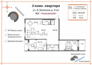 Сотрудничаем с агентами 3% пополам.3-комн квартира 134 м2, в ЖК ''Чкаловский'' 2006 г.п., с идеальной планировкой: 2 изолированные спальни, зона гостиной и кухни, 2 с/у, гардеробная, 2 лоджии.Преимущества:- ЖК бизнес класса- Дорогой дизайнерский ремонт- Абсолютно все в пешей доступностиДве квартиры на этаже. Очень тепло и тихо. Ремонт делали для себя, денег не жалели, материалы и мебель напрямую из Италии. На стенах венецианская штукатурка San Marco и текстильные обои с гобеленами Arlin, Италия. На полу художественный паркет из ценных пород дерева, а также мрамор от фабрики Cerdisa, оборудованный теплым полом. Потолок 3,0 м. Металлопластиковые окна Schuco, с энергосберегающим стеклопакетом и подоконниками из мрамора. Итальянские двери уровня элит. Кухня премиум-класса Francesco Molon, совмещена с гостиной. Фасады шкафов в полную высоту стен, со встроенной техникой: варочная панель, духовой шкаф, СВЧ, кофе машина, холодильник от Kppersbsuch. Барная стойка со столешницей из натурального мрамора, Италия. Гостиная сердце квартиры, обустроена дорогой итальянской мебелью Minnotti. ''Теплые'', натуральные фактуры дерева, текстиля, а также картины на стенах, создают обволакивающую ауру уюта.Уютная спальня, в желтом приглушенном цвете, с большой теплой лоджией. Грамотно подобрана качественная итальянская мебель, продумано локальное освещение. Кабинет оформлен в винтажном стиле, декоративные элементы помогают создать атмосферу романтики и старины, хочется что-то творить, создавать. Выход на вторую теплую лоджию.Два санузла. Душевая и джакузи Victory, Италия. Сантехника Villeroy & Boch. Кафель Versace и Gardenia Orhidea. Мебель в ванной Capelini, Италия. Гардеробная комната оборудована местами хранения и СМА Beko. Смонтированы кондиционеры Mitsubishi. Свет - мягкое карнизное и точечное освещение. Установлены итальянские светильники и люстры. Электрооборудование Bticino. В ЖК круглосуточная охрана и видеонаблюдение. На 3 этаже расположен внутренний двор, в котором можно парковать машину, скамейки для отдыха, детский уличный городок. В доме современное инженерное оснащение: своя газовая котельная, 3-х уровневая система очистки воды. На этаже есть места для велосипедов и колясок. Перед квартирой просторный холл S=30 м2 с диваном. Подземный паркинг на 60 машин.ЖК расположен в центре Петроградского р-на. Абсолютно ВСЕ в шаговой доступности! Метро ''Чкаловская'' - пешком 1 мин. Магазины (Азбука Вкуса, Super Babylon), ТЦ, школы, гимназии (56, 82), детские сады (частные и государственные), поликлиники (Управления делами Президента РФ), центры частной медицины, фитнес и спортклубы, театры, музеи, Ботанический сад. Крестовский Остров в 15 мин пешком, со всеми его прелестями: парками, ресторанами класса люкс, спортивными сооружениями, причалами для яхт. Рядом богемный Большой Проспект ПС. Отличная транспортная доступность в любую точку города. Выезд на ЗСД - 10 мин.АН Винидиктов и партнеры участник ассоциации агентств элитной недвижимости АРЕА.Арт.