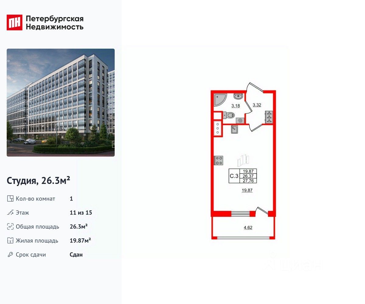26 м² · Этаж 11 из 15