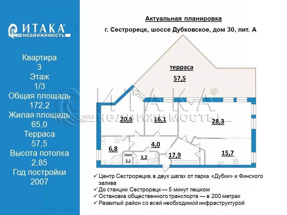 1-92640 Элитная квартира с террасой в историческом центре Сестрорецка! Представляем уникальную возможность приобрести роскошную трехкомнатную квартиру в самом сердце Сестрорецка — старинного курорта, где сочетаются спокойствие, морской воздух и отличная транспортная доступность до Санкт-Петербурга. Это не просто недвижимость, это инвестиция в особый образ жизни. Ключевые преимущества: •Идеальное расположение: Центр Сестрорецка, в двух шагах от парка ''Дубки'' и Финского залива. •Просторная терраса:уникальная терраса 57.5 кв.м., полностью меблированная мангалом и террасной мебелью, готовая для отдыха. •Отдельный паркинг: в стоимость входит 1 машиноместо в подземном паркинге. •Элитный формат: Квартира расположена на 1 этаже трехэтажного особняка. Характеристики объекта: •Площадь: общая — 114.7 кв.м. •Планировка: кухня гостиная ( 28,3+15,7 объединены одно пространство), две спальни (20,6 + 16,1), 2 санузла. •Высота потолков: 2.85 м.Кондиционеры во всех комнатах. •Коммуникации: автономное отопление и горячее водоснабжение от газового котла (комфорт и экономия в любое время года). •Закрытая территория без машин, консъерж. Транспортная доступность: •До станции Сестрорецк — 5 минут пешком. •Остановка общественного транспорта — в 200 метрах. •На автомобиле до метро ''Беговая'' — околоминут. Инфраструктура: Развитый район со всей необходимой инфраструктурой: магазины, школы, детские сады, медицинские и фитнес-центры в шаговой доступности. Дополнительная информация: •Прямая продажа от собственника (один владелец, в собственности более 5 лет). •Квартира полностью оборудована мебелью и техникой. Не упустите шанс стать владельцем этой исключительной квартиры, где встречаются история, статус и курортная атмосфера! Звоните, чтобы договориться о просмотре. Итака. Работаем с 1993 года.