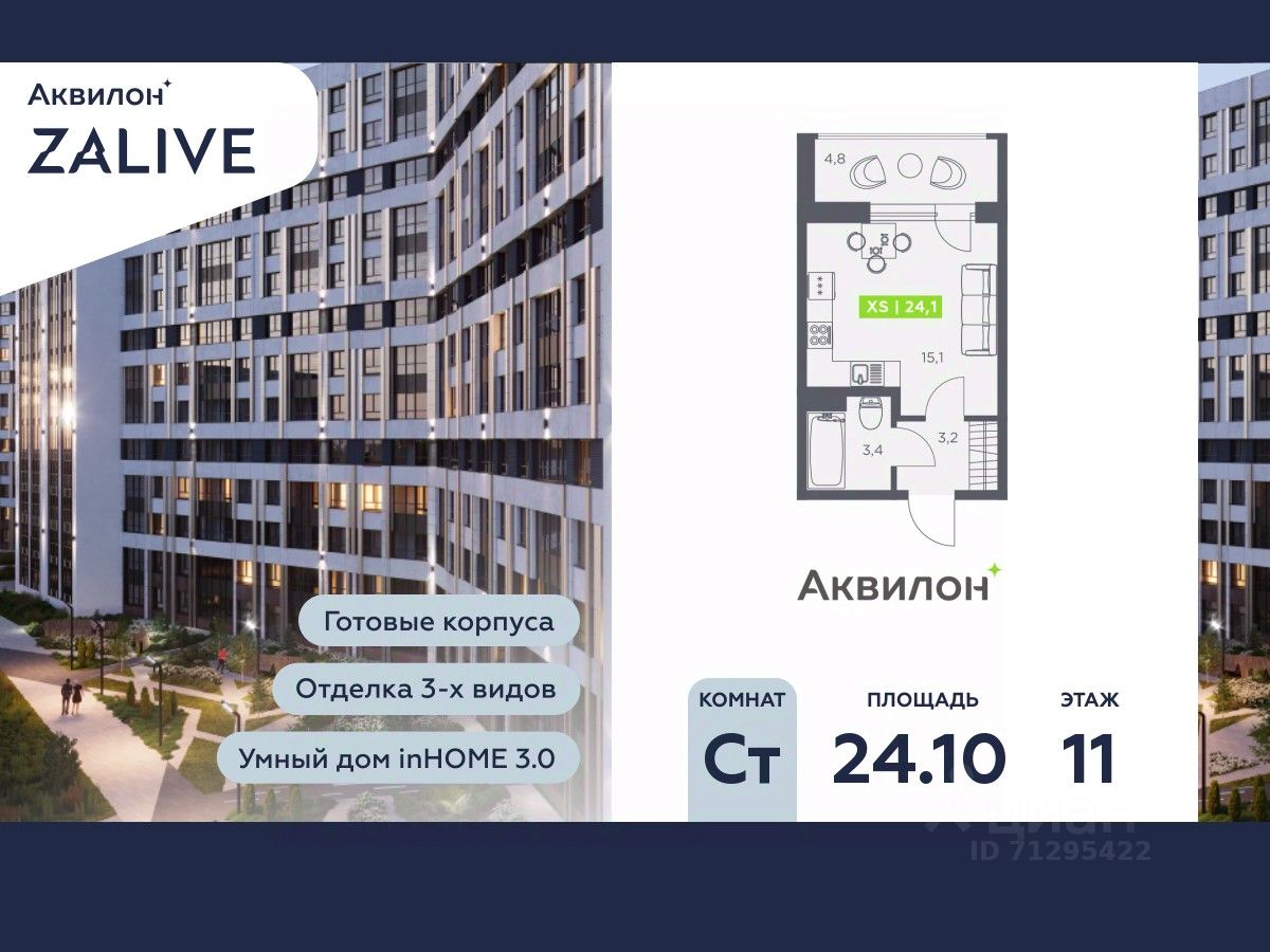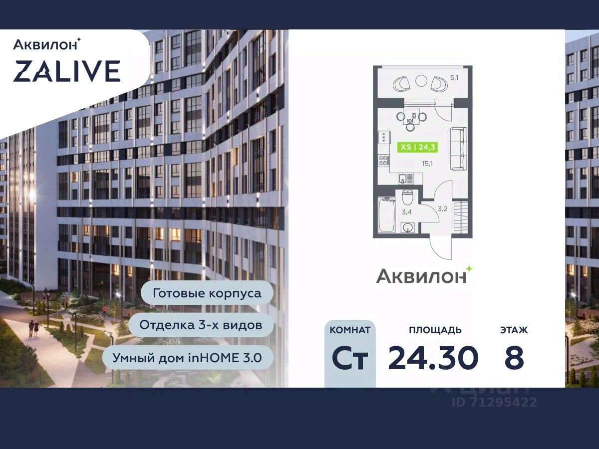 Купи квартиру в ЖК ''Аквилон ZALIVE''! Отделка В квартире выполнена предчистовая отделка WhiteBox +Возможен дозаказ отделки в любом из 3 цветов: SAND, TERRA, GRAPHITE Отделка входит в стоимость квартиры в ДДУ ЖК ''Аквилон ZALIVE'' Жилой комплекс ''Аквилон ZALIVE'' расположился в уникальной части престижного Васильевского острова. С одной стороны рядом деловой и исторический центр, с другой берег Финского залива и новая современная инфраструктура в пешей доступности. Проект включает в себя пять тринадцатиэтажных ''умных'' домов в едином архитектурном стиле. Насыщенная социальная инфраструктура, инновации в каждой квартире, стильное благоустройство территории и видовые характеристики это лишь часть уникальных преимуществ жилого комплекса ''Аквилон ZALIVE''. -Малошумные лифты -Сквозные парадные -Светопрозрачные входные группы -Школа во дворе -Безбарьерная среда -Паркинг Стандарты Группы Аквилон для вашей комфортной жизни Thermo-S экономия на коммунальных платежах за счет дополнительно утепленных стен, кровли и цоколя. Энергоэффективные окна с селективным покрытием и аргоновым заполнением Soundstop - дополнительная шумоизоляция внутренних перегородок и межэтажных перекрытий, шумозащитные окна, малошумные лифты Light-in - в квартирах устанавливаются широкоформатные окна, увеличены на 30%. Высота подоконников на уровне 60 см от пола. Vent-in - в каждой комнате есть клапаны индивидуальной вентиляции, которые обеспечивают приток свежего воздуха с улицы. inHOME умный дом в каждой квартире Интеллектуальная цифровая система, которая позволит дистанционно решать бытовые вопросы, управлять квартирой и экономить на оплате коммунальных услуг. В состав inHOME входят: IP-домофон, Face key, ''умные'' счетчики, датчики протечки, дистанционное отключение розеток, и т.д. Двор ваш личный парк Для разработки проекта благоустройства и озеленения Группа Аквилон привлекла студию DEREVO PARK, которую ассоциация ландшафтных архитекторов России четыре года подряд признавала лучшей. Два хвойных сада, расположенные вдоль западной стороны квартала, станут визитной карточкой ЖК ''Аквилон ZALIVE''. Локация и инфраструктура Васильевский остров это море и прогулки, Санкт-Петербургский Государственный Университет и Ростральные колонны, музей современного искусства ''Эрарта'' и концептуальное пространство ''Севкабель Порт''. Достаточно переехать через мост и вот вы уже в центре или на Петроградской стороне. - 7 мин. до развязки ЗСД -12 мин. до м. Приморская -15 мин. до м. Невский проспект #24Scv0