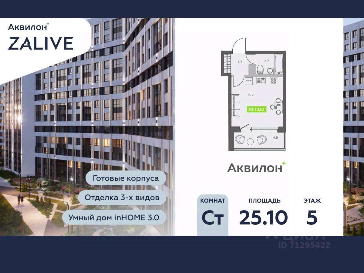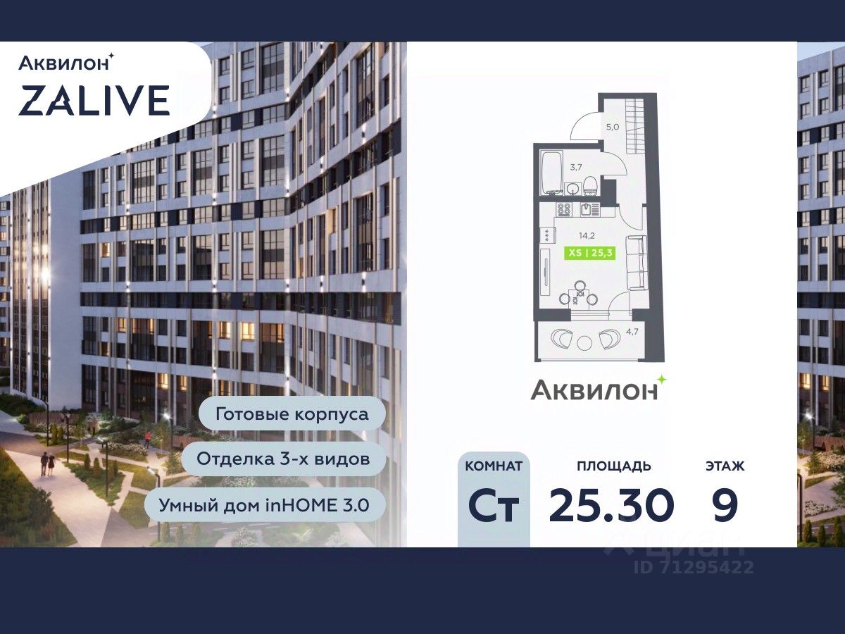 Купи квартиру в ЖК ''Аквилон ZALIVE''! Отделка В квартире выполнена предчистовая отделка WhiteBox +Возможен дозаказ отделки в любом из 3 цветов: SAND, TERRA, GRAPHITE Отделка входит в стоимость квартиры в ДДУ ЖК ''Аквилон ZALIVE'' Жилой комплекс ''Аквилон ZALIVE'' расположился в уникальной части престижного Васильевского острова. С одной стороны рядом деловой и исторический центр, с другой берег Финского залива и новая современная инфраструктура в пешей доступности. Проект включает в себя пять тринадцатиэтажных ''умных'' домов в едином архитектурном стиле. Насыщенная социальная инфраструктура, инновации в каждой квартире, стильное благоустройство территории и видовые характеристики это лишь часть уникальных преимуществ жилого комплекса ''Аквилон ZALIVE''. -Малошумные лифты -Сквозные парадные -Светопрозрачные входные группы -Школа во дворе -Безбарьерная среда -Паркинг Стандарты Группы Аквилон для вашей комфортной жизни Thermo-S экономия на коммунальных платежах за счет дополнительно утепленных стен, кровли и цоколя. Энергоэффективные окна с селективным покрытием и аргоновым заполнением Soundstop - дополнительная шумоизоляция внутренних перегородок и межэтажных перекрытий, шумозащитные окна, малошумные лифты Light-in - в квартирах устанавливаются широкоформатные окна, увеличены на 30%. Высота подоконников на уровне 60 см от пола. Vent-in - в каждой комнате есть клапаны индивидуальной вентиляции, которые обеспечивают приток свежего воздуха с улицы. inHOME умный дом в каждой квартире Интеллектуальная цифровая система, которая позволит дистанционно решать бытовые вопросы, управлять квартирой и экономить на оплате коммунальных услуг. В состав inHOME входят: IP-домофон, Face key, ''умные'' счетчики, датчики протечки, дистанционное отключение розеток, и т.д. Двор ваш личный парк Для разработки проекта благоустройства и озеленения Группа Аквилон привлекла студию DEREVO PARK, которую ассоциация ландшафтных архитекторов России четыре года подряд признавала лучшей. Два хвойных сада, расположенные вдоль западной стороны квартала, станут визитной карточкой ЖК ''Аквилон ZALIVE''. Локация и инфраструктура Васильевский остров это море и прогулки, Санкт-Петербургский Государственный Университет и Ростральные колонны, музей современного искусства ''Эрарта'' и концептуальное пространство ''Севкабель Порт''. Достаточно переехать через мост и вот вы уже в центре или на Петроградской стороне. - 7 мин. до развязки ЗСД -12 мин. до м. Приморская -15 мин. до м. Невский проспект #z4SC8s