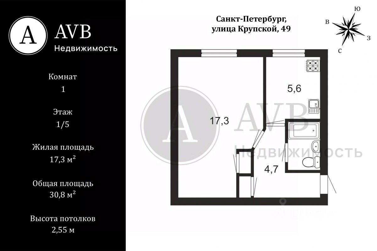 Предлагается к продаже 1-комнатная квартира по адресу: Санкт-Петербург, ул. Крупской, д. 49, лит. А. Квартира расположена на 1 этаже 5-этажного кирпичного дома 1961 года постройки. Характеристики: общая площадь 30,8 м² жилая 17,3 м² кухня 5,6 м² высота потолков 2,55 м санузел совмещенный окна на улицу состояния квартиры: косметический ремонт мебель и техника остаются Подъезд чистый, дом тёплый, район с развитой инфраструктурой и удобной транспортной доступностью. Юридическая чистота: один собственник, прямая продажа, полная стоимость в договоре. Быстрый выход на сделку. Готовы показать в удобное время. Номер объекта: #1/536932/24310