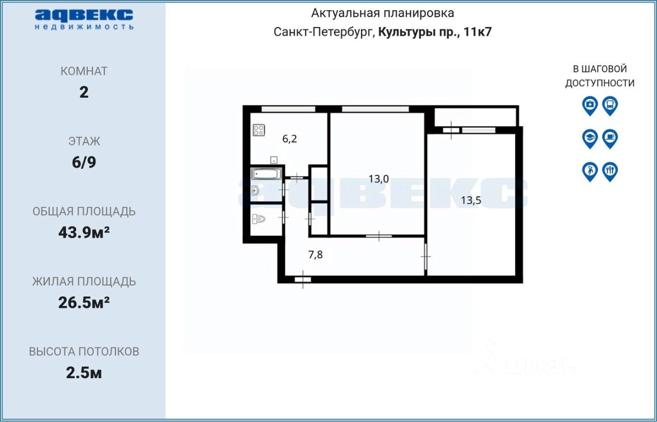 Уютная квартира в Прямой продаже на проспекте Культуры, равноудаленная от 2 станций метро, Гражданский проспект и Проспект Просвещения, по Привлекательной цене! - Отличное месторасположение! Все что нужно для комфортного проживания в шаговой доступности : супермаркеты, торговые центры, рестораны, банки, мед. учреждения и многие другие учреждения социальной сферы. - Благоприятная экология, зеленый микрорайон есть возможность для прогулок. - Ваш авто всегда под боком - есть возможность парковки рядом с домом - Квартира расположена на комфортном 2эт/9 эт ПН Дома , чистая парадная. - Удобная планировка квартиры: Общ.пл.33,5 м.кв, комната 17,5 м.кв., кухня 8 м.кв. - Прямая продажа! - Собственность более 5-ти лет, полная стоимость будет указана в договоре. Покупайте и живите уверенно! Стоимость 6550 тыс. рублей. Оптимальное соотношение Цена-Качество! Чтобы узнать подробности, договориться на просмотр и сделать Выгодное приобретение ЗВОНИТЕ.