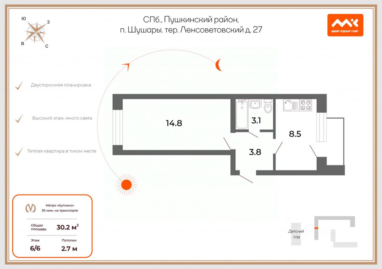 Арт. 129625202 Уважаемый покупатель, представляем Вашему вниманию однокомнатную квартиру, расположенную в Пушкинском районе Санкт-Петербурга, в поселке Шушары. Дом 2007 года постройки находится по адресу тер. Ленсоветовский, лит. А, дом 27. Большой зеленый двор с зоной отдыха под высокими елями. Район с устоявшейся инфраструктурой: школа, детские сады, поликлинники, бассейн, магазины, кафе. До станции метро купчино 30 минут на транспорте, остановка в 7-ми минутах пешком. Прямой выезд на Московское шоссе. Предлагаемая квартира общей площадью 30,2 кв.м. расположена на светлом 6 этаже и имеет двустороннюю планировку, окна которой выходят во двор и на Детский сад 24. Выполнена предчистовая отделка, установлена сантехника. Квартира очень светлая, отлично отапливается зимой и проветривается летом. Есть балкон. Эта квартира создана для счастливой жизни в тихом районе! Звоните, с радостью ответим на ваши вопросы! Предлагаем ПРЕМИАЛЬНОЕ обслуживание для требовательных клиентов. Оперативно организуем просмотр, предоставим полную информацию по объекту. 20 лет работы с требовательными клиентами подготовили нас к решению ВАШИХ сложных задач. Будем рады знакомству! Ул. Рубинштейна, д.8.