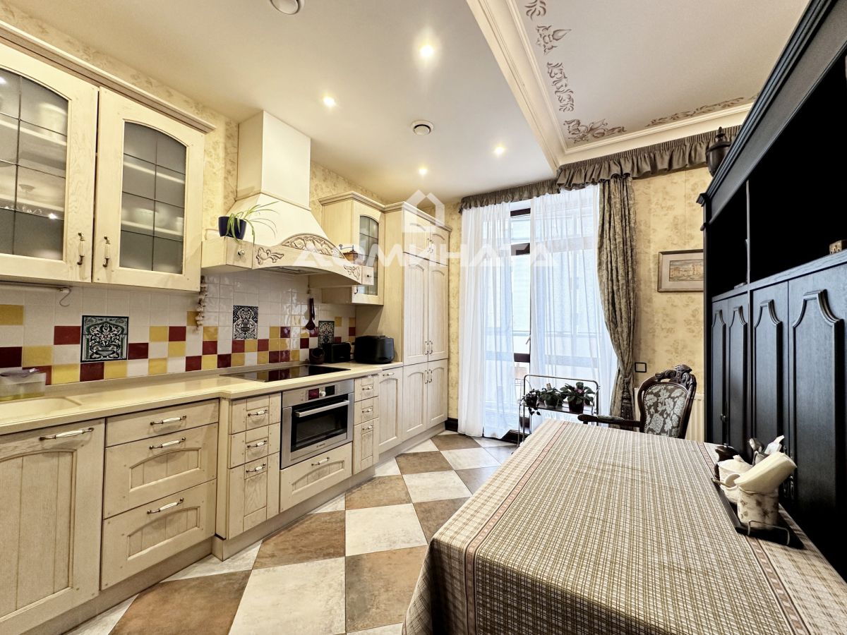 Современная Петербургская классика. Удобство и роскошь. Просторная квартира в ЖК ''Новый город'' 2010 г.п. на правом берегу Невы напротив Смольного собора. Комплекс выполнен в клубном стиле. Малоэтажный, малонаселенный. Просторные квартиры и рекреационные зоны, 2 квартиры на этаже. Закрытая территория. Подземный паркинг, спуск на лифте к машине. Служба консьержей. Квартира расположена на 6(10)этаже. Общая площадь - 183,1м2. 4 спальни + комната-кухня 55,3м2 3 лоджии, 2 сан/узла, постирочная. Сауна. Высота потолка - 2,97м. Шедевр перфекционизма. В рамках дизайн-проекта по специально разработанным чертежам изготовлены дверные порталы, полотна дверей, плинтуса, зеркала в прихожей и ванной массив дуба. Паркет массив дуба, Франция, стиль старинного ''паркетри'' используемого в замковых интерьерах. Сантехника элитные коллекции Grohe, Laufen, Ideal Standard и т.д. Люстры в гостиной бронза, богемский хрусталь, Bohemiaivelecrystal, Чехия. Принудительная приточная вентиляция - 3-х фазное оборудование с подогревом воздуха и подготовкой под канальный кондиционер. Кухня - массив дуба, индивидуальный проект. Электроарматура (розетки, выключатели) - Merten system design, Германия. Мебель и предметы интерьера Fabian Smith. Окна и балконные двери деревянный стеклопакет. Уникальный и неповторимый интерьер: - ручная роспись потолков, - фрагменты облицовки клинкерным кирпичом, - ''паркетри'' в гостиной и в других комнатах, - напольный кафель в клетку в стиле начала 18 века, - мотивы ''петровского времени'' в лепнине, наличниках дверей и др. архитектурных и декоративных деталях, - коллекция плитки под изразцы в санузлах, и многое другое. Квартира мало амортизирована. В исключительно хорошем состоянии. Убедитесь сами! Также в продаже 2 машиноместа по 12,5 кв.м (5м*2,5м) в подземном теплом паркинге.