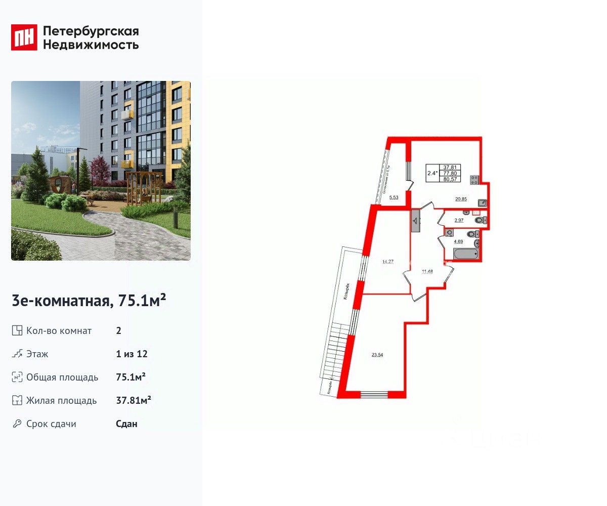 Продается просторная 2-комнатная квартира от застройщика в жилом комплексе ''Прайм Приморский'' в динамичном Приморском районе. До метро можно добраться на транспорте всего за 15 минут. Удобная, классическая, функциональная европланировка, большая кухня-гостиная 20.85 м², просторная прихожая 11.48 м². Общая площадь квартиры - 75.1 м², жилая 37.81 м², высота потолка 2.77 м. Квартира продается с отделкой ''Норд Лайн светлый комфорт''. Что особенного в ЖК ''Прайм Приморский''? • Живописные виды на Шуваловский карьер и лесной массив • ''Парящие'' французские балконы • Центральная входная группа • Креативное пространство в центре проекта, летняя терраса для отдыха • Приватные лаундж-зоны на крыше домов (3 корпус)
