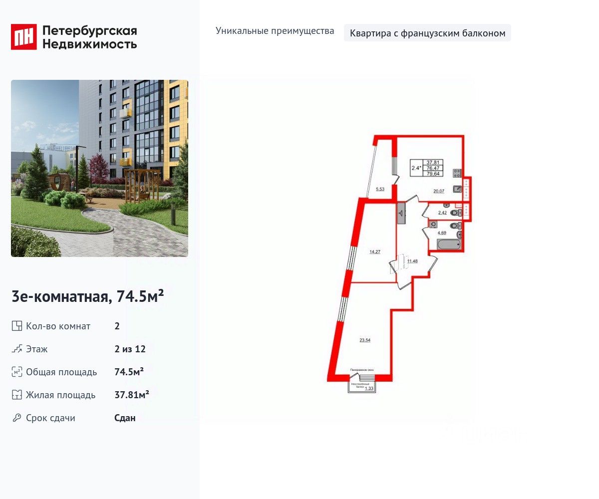 Продается просторная 2-комнатная квартира от застройщика в жилом комплексе ''Прайм Приморский'' в динамичном Приморском районе. До метро можно добраться на транспорте всего за 15 минут. Французский балкон придает особенный европейский шик комнате. Уникальная, функциональная европланировка, большая кухня-гостиная 20.07 м², просторная прихожая 11.48 м². Общая площадь квартиры - 74.5 м², жилая 37.81 м², высота потолка 2.77 м. Квартира продается с отделкой ''Норд Лайн серый комфорт''. Что особенного в ЖК ''Прайм Приморский''? • Живописные виды на Шуваловский карьер и лесной массив • ''Парящие'' французские балконы • Центральная входная группа • Креативное пространство в центре проекта, летняя терраса для отдыха • Приватные лаундж-зоны на крыше домов (3 корпус)