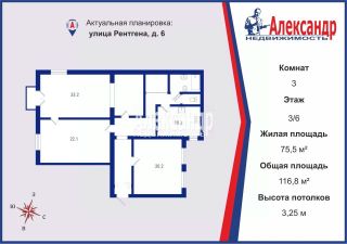 1705202 В одном из красивейших районов Санкт-Петербурга, в прямой продаже 3 комн. квартира, в самом центре Петроградки. Объект недвижимости, с параметрами 117/ 33+22+20/ 10 м кв, в хорошем состоянии, с оригинальным ремонтом, расположен на 3/6 этажного, кирпичного дома. За двойной дверью ( металлическая и стеклянная), при входе в квартиру, красиво оформленная прихожая, 3 просторные комнаты, два сан.узла, большая гардеробная, небольшой балкон, кухня оборудованная мебелью и бытовой техникой, и отдельная зона приема пищи 10 м кв, примыкающая к гостиной. Высокие потолки- 3,25 м, создают ощущение свободного пространства и дополнительной площади. На окнах современные ст/пакеты. Полы: в местах общего пользования кафельная плитка, в комнатах - ламинат. Планировка объекта - двусторонняя: две комнаты выходят на ул. Рентгена, кухня и третья комната - в закрытый зеленый двор. Толстые кирпичные стены, квартира с хорошей тепло и шумоизоляцией. Вход с огороженного двора. Имеется парковочное место на придомовой территории. Здание в стиле сталинского неоклассицизма, по индивидуальному проекту ( Архитекторы: Гурьев О. И., Фромзель В. М.) было построено в 1950-54 гг. Один собственник. Никто не прописан. Полная стоимость в ДКП. Без обременений. 6-7 мин пешком до ст м Петроградская, 12-14 мин. - до ст м Горьковская. Рядом сквер Низами, спортивная площадка, сад Андрея Петрова, сад Александровского лицея, СК Петроградец, службы быта, множество развлекательных объектов, ДК им. Ленсовета, Театр им. Андрея Миронова, Ботанический сад, несколько разнопрофильных гимназий, школы, в том числе и музыкальная, а также детские садики и центры раннего развития.