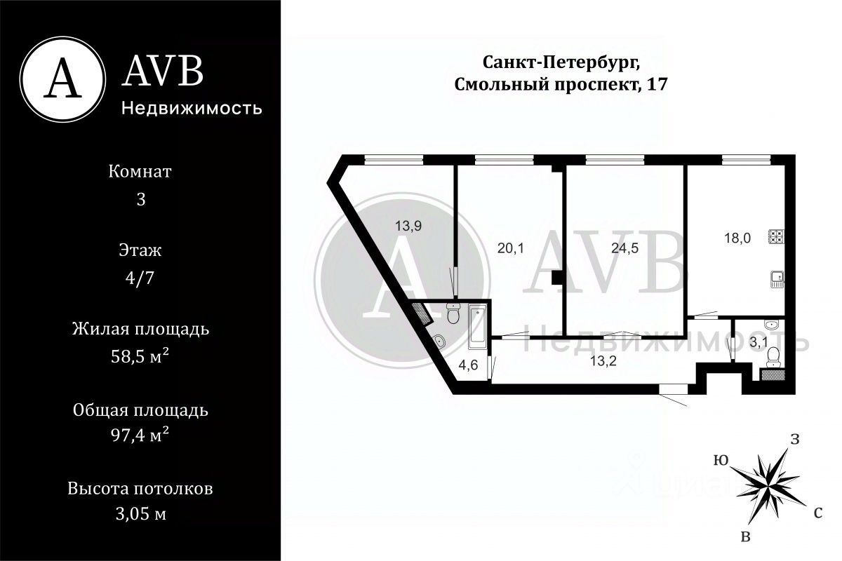 3-комн. квартира 97,4 м² с дизайнерским ремонтом в элитном ЖК ''Смольный проспект'' — Смольный пр., 17 Продаётся просторная 3-комнатная квартира в элитном жилом комплексе на Смольном проспекте, 17. 4 этаж из 7, потолки 3,05 м, квартира полностью готова к проживанию: дизайнерский ремонт, мебель и техника — заезжай и живи. Планировка (по плану) Общая площадь: 97,4 м² Жилая: 58,5 м² Комнаты изолированные: 24,5 м² / 20,1 м² / 13,9 м² Кухня-гостиная: 18,0 м² Холл: 13,2 м² 2 санузла: 4,6 м² + 3,1 м² Грамотное зонирование: приватная часть (спальни) отделена от гостевой зоны. Удобно для семьи, кабинета/гостевой комнаты. Ремонт и комплектация дизайнерский ремонт в современном стиле качественные материалы встроенная кухня, техника, продуманные места хранения квартира не требует вложений Дом и локация Элитный комплекс в историческом центре: статусное окружение, тишина, рядом парки и набережные, удобный выезд в центр города. Документы готовы. Быстрый выход на сделку. Звоните/пишите — отправлю видео и организую просмотр. Номер объекта: #1/536951/24310