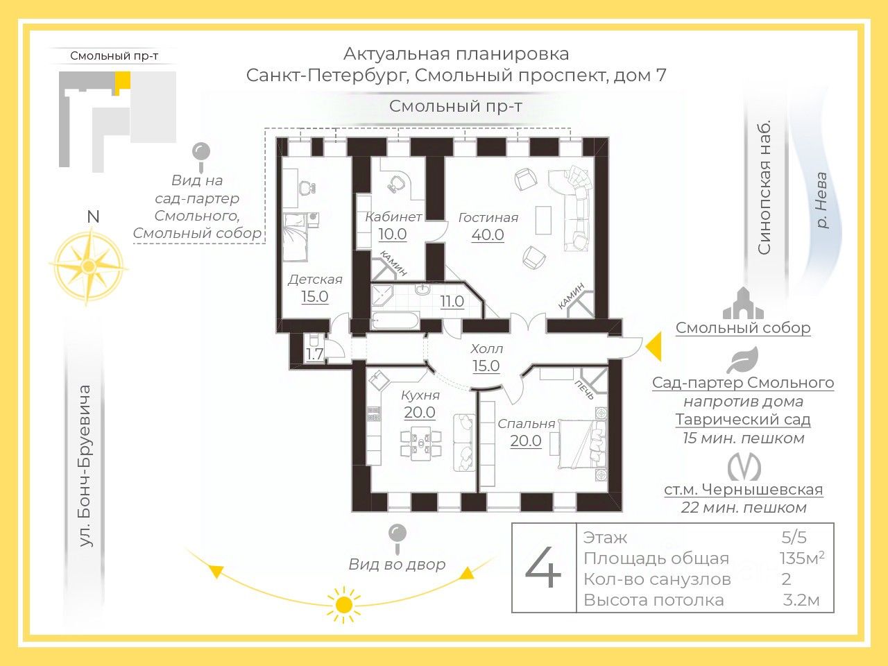 Продается уникальная 4-комнатная квартира площадью 124,1 м2 в знаменитом доме профессоров Смольного института, построенном в 1906 году академиком архитектуры А. Ф. Красовским. Это единственный дом, расположенный прямо в Саду-Партере Смольного. Высокие потолки 3,55 м создают ощущение простора. Три камина и балкон с видом на Смольный проспект придают особый шарм. Дом исторический, но полностью отреставрирован: парадная поражает своей красотой, видеонаблюдение по периметру, круглосуточные посты ФСО и МВД, надежная охрана и консьерж. Локация подчеркивает статус: всего 2 минуты пешком до здания правительства Санкт-Петербурга и кабинета губернатора. Чистая продажа: квартира без обременений, в прямой продаже. Готовы оперативно выйти на сделку. Звоните!