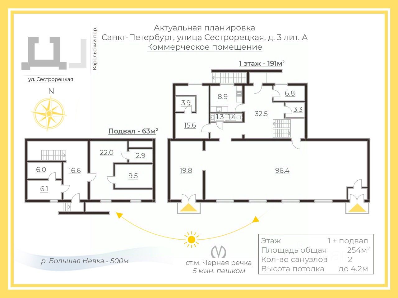 Арт. 118724500 Продаётся просторное универсальное коммерческое помещение с четырьмя отдельными входами, всего в 7 минутах ходьбы от метро ''Чёрная Речка''. Характеристики помещения: Торговый зал 118 м² (1 этаж) с шестью арочными окнами с потолками 4,20 м и большими арочными окнами, которые обеспечат естественное освещение и подчеркнут статус вашего бизнеса. Два отдельных входа с улицы — удобство для клиентов и высокая проходимость. Рабочая зона 76 м²: кухня, санузел, офис, кабинет и бухгалтерия. Отдельный вход со двора, потолки 3,02 м. Полноценная инфраструктура для организации любого формата работы. Подвал 62 м² с высотой потолков 2,25 м и двумя входами (со двора и из зала). Отлично подойдёт под склад, подсобные помещения или небольшой торговый зал. В 2025 году заменены все коммуникации водоснабжения и водоотведения. Преимущества: Гибкая планировка, позволяющая адаптировать пространство под любые задачи. Удобное расположение и несколько входов повышают функциональность и привлекательность для клиентов. Высокие потолки и светлые окна создают эффект простора и делают зал максимально презентабельным. Возможные варианты использования: магазин любого формата, ресторан или кофейня, фитнес-зал или студия йоги, салон красоты, медицинский центр или аптека, офисные и складские помещения. Помещение подойдёт как для развития собственного бизнеса, так и для сдачи в аренду с высокой доходностью.