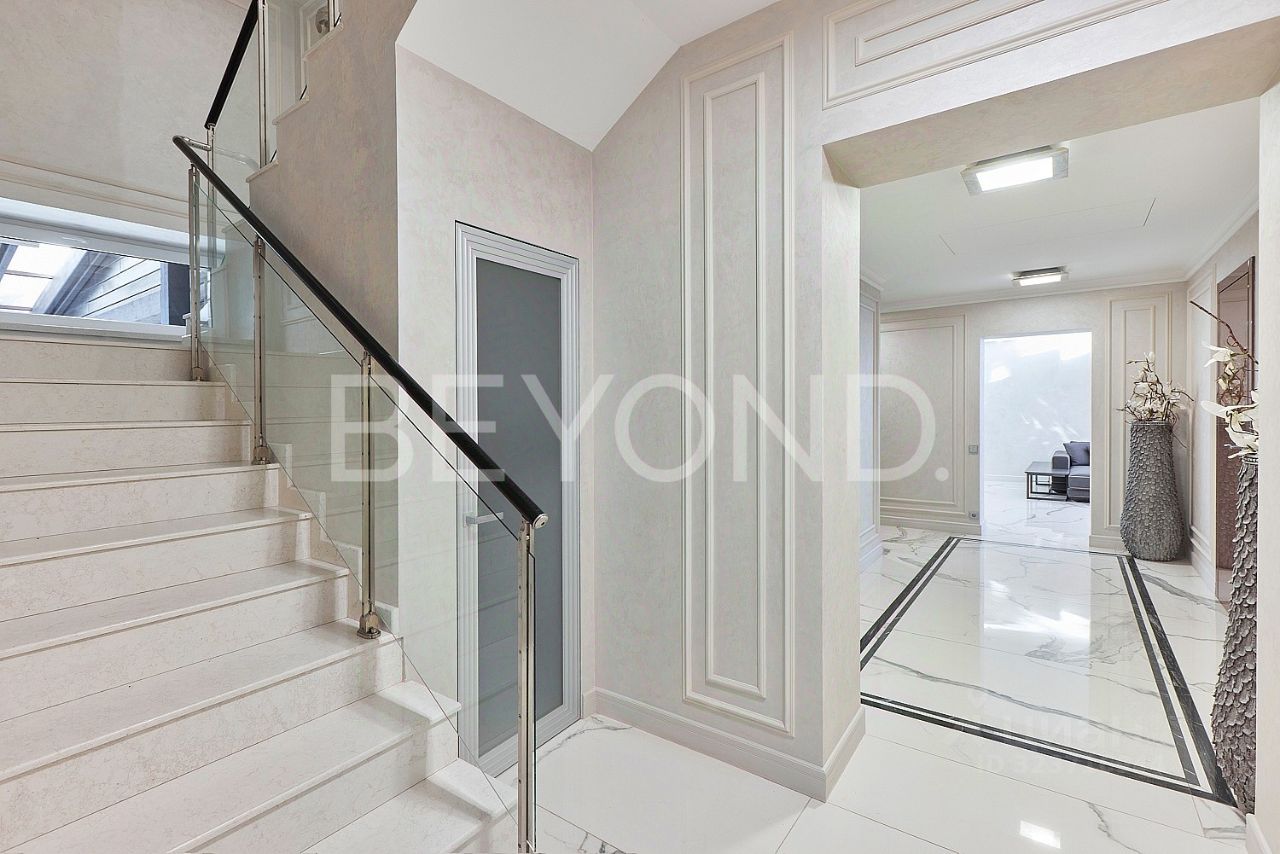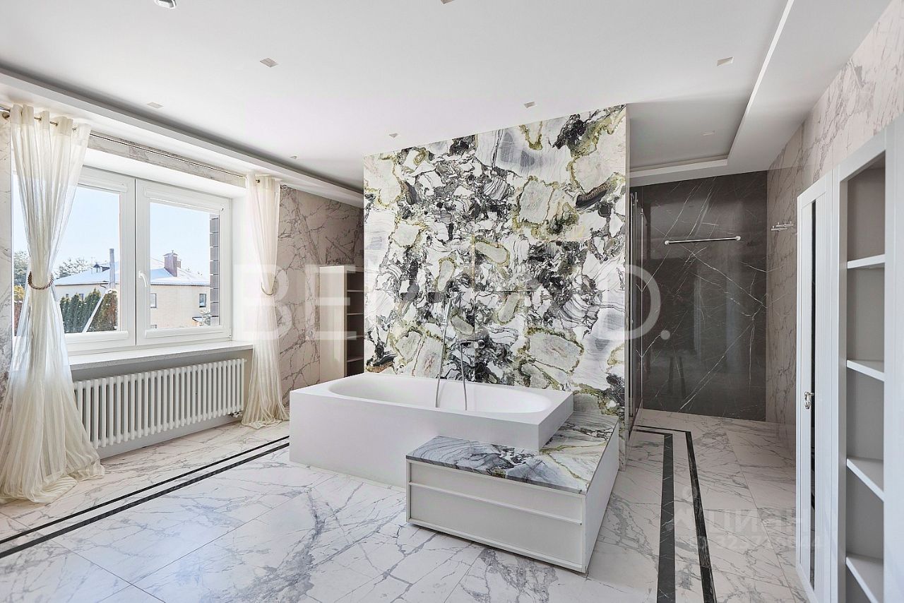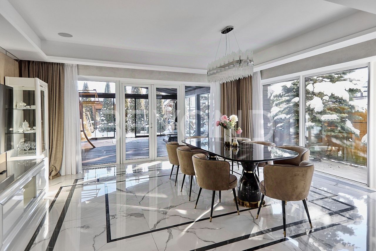 Предлагается к покупке трехэтажный дом 594,7 кв. м, с террасой 40 кв. м с панорамным остеклением, гаражом на три а/м и банным комплексом. Элегантный объект со стилистикой Ар-деко: много блеска, полутона природных красок, четкая геометрия каждого помещения. Баланс между металлом, деревом, камнем и стеклом. Место, где много света и воздуха. В доме 7 спален, 4 санузла, кабинет, гостиная-кухня-столовая, детские, кинотеатр, технические помещения и мансардная часть, куда выведены все инженерные узлы. Первый этаж единое пространство, в котором соединены гостиная с камином с отделкой из оникса, кухня и столовая с выходом на террасу. Кухня с итальянскими комплектующими и техникой Kuppersbusch. Зонирование делает особенно красивым сверкающие люстры и отделка камнем. Второй этаж это приватная зона. Пять спален. Большой холл с местами для хранения. Ванная комната с окном - 17,5 кв. м отделана мрамором и спроектирована так, чтобы всем было комфортно. Мастер-спальня с огромной кроватью от Fendi, брутальные лампы и мебель от Eichholtz. Стены спальни обшиты тактильно приятным текстилем. Мастер-гардеробная комната изыскана, функциональна и вместительна. Каждая из остальных спален индивидуальна. Они прекрасно подходят для разнополых детей различного возраста. Во всех спальнях дубовый паркет. Особое место в доме занимает кинозал на третьем этаже, где по проекту запланирован еще бильярд. Две гостевые спальни и санузел. Система кондиционирования и приточно-вытяжная вентиляция. Два водяных контура: первый отапливает дом, второй зону въезда. Отопление газовое. Банный комплекс из клееного бруса Honka с сауной, может рассматриваться, как гостевой дом. По внешнему периметру - система видеонаблюдения. В доме все коммуникации городские: электричество, газ, вода, канализация. На участке общей площадью 1200 кв. м сделан ландшафт и мощение.