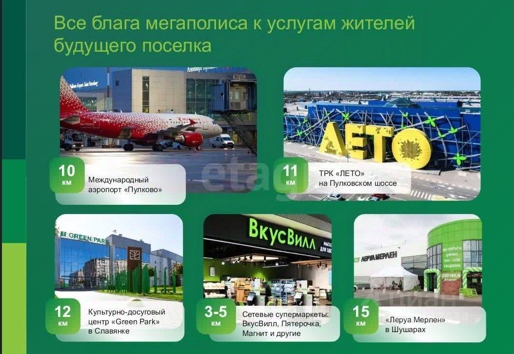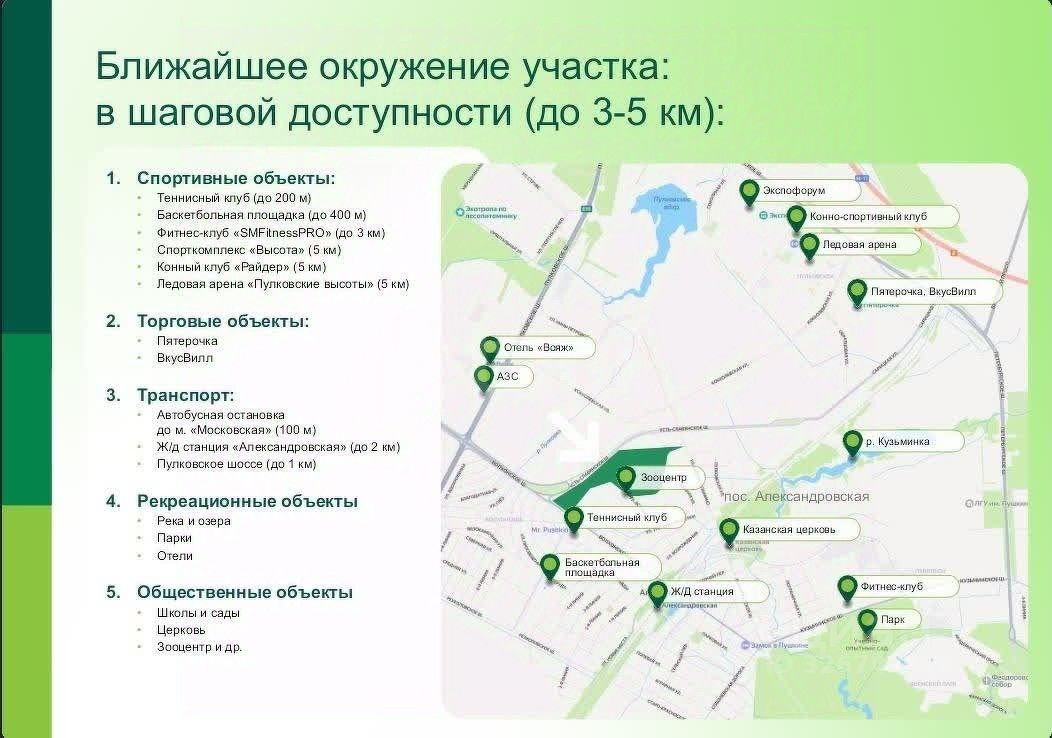 К продаже предлагается УНИКАЛЬНЫЙ участок под строительство коттеджного поселка премиум класса (ИЖС) площадью 4,33 гектар (433сотки) вблизи Санкт-Петербурга! Мы потратили 4 года на то, чтобы вы смогли сразу приступить к строительству! За это время мы: • провели регистрацию и межевание, • осуществили необходимые изыскания, • разработали единый инженерный план строительства коттеджного поселка, • получили ТУ для подключения коммуникаций. Участок расположен на юге Санкт-Петербурга. Примыкает к поселку Александровская и г. Пушкин 1 км (2 минуты) до Пулковского шоссе 6 км (10 минут) до центра г. Пушкин 8 км (10 минут) до КАД 10 км (12 минут) до Аэропорта Пулково 12 км (14 минут) до метро Московская 1 собственник, без обременений! Ближайшее окружение участка: в шаговой доступности (до 3-5 км): 1. Спортивные объекты: • Теннисный клуб (до 200 м) • Баскетбольная площадка (до 400 м) • Фитнес-клуб ''SMFitnessPRO'' (до 3 км) • Спорткомплекс ''Высота'' (5 км) • Конный клуб ''Райдер'' (5 км) • Ледовая арена ''Пулковские высоты'' (5 км) 2. Торговые объекты: • Пятерочка • ВкусВилл 3. Транспорт: • Автобусная остановка до м. ''Московская'' (100 м) • Ж/д станция ''Александровская'' (до 2 км) • Пулковское шоссе (до 1 км) 4. Рекреационные объекты • Река и озера • Парки • Отели 5. Общественные объекты • Школы и сады • Церковь • Зооцентр и др Великолепная транспортная доступность! Код пользователя: 103625 Номер в базе: 11735519