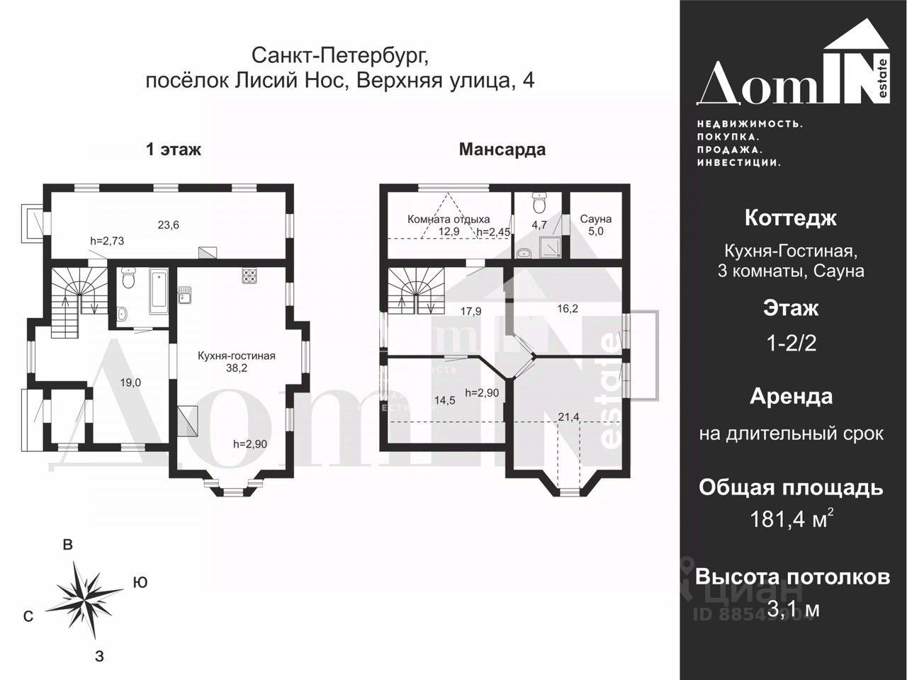 ID: 391015 Сдается в долгосрочную аренду дом в Лисьем Носу, курортной зоне г. Санкт-Петербурга. В пешей доступности пляжи Финского залива, территория заказника. Хорошая транспортная доступность, можно добраться как на автомобиле, так и общественным транспортом, включая электричку. В доме есть вся необходимая техника для комфортного проживания. На первом этаже просторная кухня-гостиная, постирочная, с/у, отдельная зона для проживания персонала. Четыре комнаты на втором этаже оборудованы спальными местами и имеют собственные с/у, три комнаты свободны от мебели. Третий этаж - единое пространство, выделен с/у. Участок 13 соток, огорожен. Рассматривается возможность с правом субаренды, при этом стоимость аренды будет обсуждаться индивидуально. Звоните, отвечу на интересующие Вас вопросы!