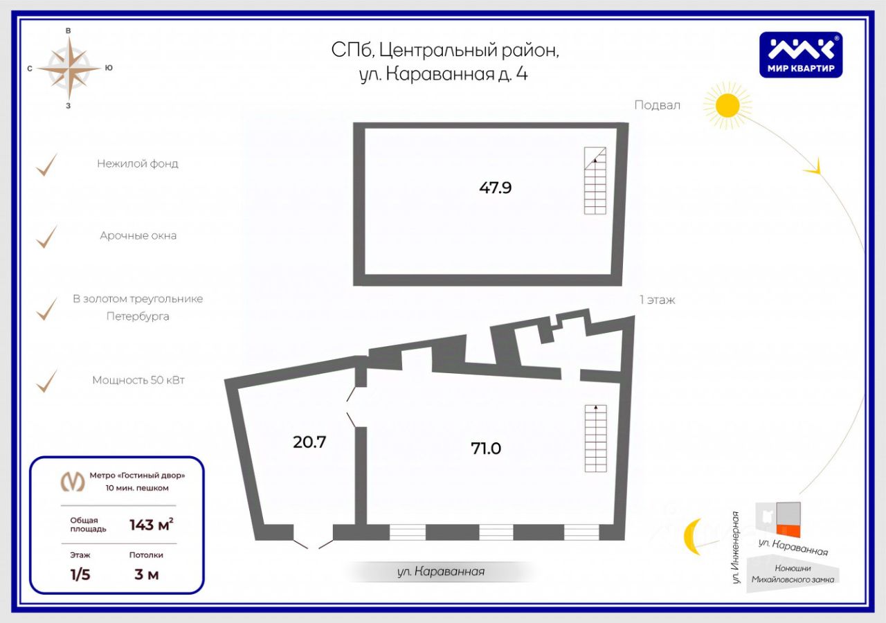 Арт. 118377740 Сдаётся коммерческое помещение 143 кв.м. В Центральном районе, на Караванной улице. Помещение расположено в нежилом здании. Второй дом от цирка и по. Белинского. Три окна на Караванную улицу. Высокий потолок с арочными сводами Отдельный вход с улицы, второй выход во двор. Удобная планировка. Большой торговый зал 70 м.кв. Помещение двухуровневое, есть подвал 40 м.кв. Черновая отделка. Каникулы на ремонт. Электричество 50 кВт. + Комиссионные агентству 50% Предлагаем ПРЕМИАЛЬНОЕ обслуживание для требовательных клиентов. Оперативно организуем просмотр, предоставим полную информацию по объекту. 20 лет работы с требовательными клиентами подготовили нас к решению ВАШИХ сложных задач. Будем рады знакомству! Ул. Рубинштейна, д.8.
