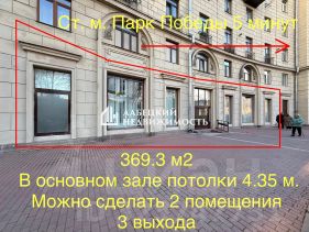 Добрый день!Предлагаем в аренду редкое ФАСАДНОЕ коммерческое помещение 369.3 м2, на Московском проспекте д. 171, с 6-ю большими ВИТРИННЫМИ окнами, высотой потолков на 1 этаже в основном зале - 4.35 м., с 2-мя выходами во двор, со 2 этажом и подвалом.Отлично подойдет для: большого магазина, офиса, торгового помещения, кафе, пекарни, ресторана, либо других деятельностей, ! БЕЗ КOMИCCИИ !Кстати, если Вы сейчас продаёте свою недвижимость, то мы можем СРАЗУ КУПИТЬ её! Описание и фотографии соответствуют действительности.Про условия аренды:-Помещение сдается на ДЛИТЕЛЬНЫЙ срок,-Договор аренды заключается с юр. лицом, БЕЗ НДС,-После подписания договора необходимо оплатить 1 месяц аренды и 1 месяц залога,-Коммунальные услуги не включены в стоимость,-Готовы предоставить арендные каникулы,Про помещение:-1 этаж - 153 м2, основной зал, потолки 4.35 м., высокие окна, чистовая отделка, 2 этаж - 103.1 м2, подвал - 108.8 м2,-6 витринных панорамных окон на улицу и сквер,-1 главный вход, можно разделить на 2, 2 отдельных выхода во двор для разгрузки/погрузки, 1 выход через окно,-Возможность разделить и сделать 2 отдельных помещения со своих входом и выходом, а так же санузлом,-Электрическая мощность - 33 кВт,-Сплит система, кондиционеры, приточная вентиляция, охрана, пожарная сигнализация, система видеонаблюдения, место для лифт-подъемника, -Помещение находится в жилом Сталинском доме,Про инфраструктуру:-Станция метро ''Парк Победы'' в 5 минутах, -Высокий пешеходный и транспортный трафик,-Окружение: бутики, банки, офисы класса А, гостиницы, парки, национальная библиотека и многое другое,Готовы рассмотреть любые предложения, звоните, ответим на все вопросы и с удовольствием покажем Вам помещение)