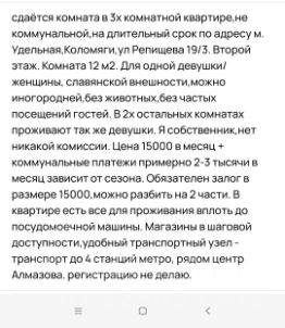 ДЕЛАЕМ РЕГИСТРАЦИЮ ДЛЯ ПРЕДСТАВИТЕЛЕЙ СНГ!Кроме той комнаты что показана в объявлении, в квартире есть еще одна свободная комната, с балконом, и холодильником внутри, по той же цена. Пишите в личные сообщения, или звоните, для того чтобы уточнить детали. В обеих комнатах, готовы сделать регистрацию для граждан Снг.Комната 17м² с отдельным балканом в очень просторной и уютной 135 м² 4-х комнатной квартире, в зеленом районе города. 5 этаж из 10. Дом достаточно новый, 2009 года постройки.В квартире есть вся необходимая техника и мебель для комфортного проживания. Есть отдельная кладовая, удобная для хранения хоз. товаров. В коридоре небольшой гардероб для верхней одежды и обувница. Санузел раздельный.Полностью обжитый и благоустроенный район. В пешей доступности - Финский залив с набережной, песчаный пляж, в пешей доступности Южно-Приморский парк, в котором есть аттракционы , лодочная станция, кафе, рестораны и фонтаны. Рядом с домом есть все для комфортной жизни : поликлиники, детские сады, школы, развивающие центры, ТРЦ ''Жемчужная плаза'', Призма, а также все необходимые сетевые магазины, фитнес-центры, аптеки, банки и т.д.Отличная транспортная развязка, остановка рядом с домом, большое количество маршрутных такси, автобусов, троллейбусов.До центра 30-45 минут на машине. Недалеко заезд на КАД и ЗСД. У дома всегда есть места для парковки.Транспортная доступность:- 15 минут до ст.м. Проспект Ветеранов- 20 минут до ст.м. Автово- 15-20 минут до ст.м. Ленинский проспект- 30 минут до центра города на авто- Удобный выезд на КАД( 3,5 км Дачный проспект, 11 км Таллинское шоссе.)Условия аренды:— Залог 100% ( можно разбить на части)— Договор ( минимум на 6 месяцев)— К/У отдельно— Курение в квартире запрещено.Предоплата за 1 месяцЗалог 16 000 ₽