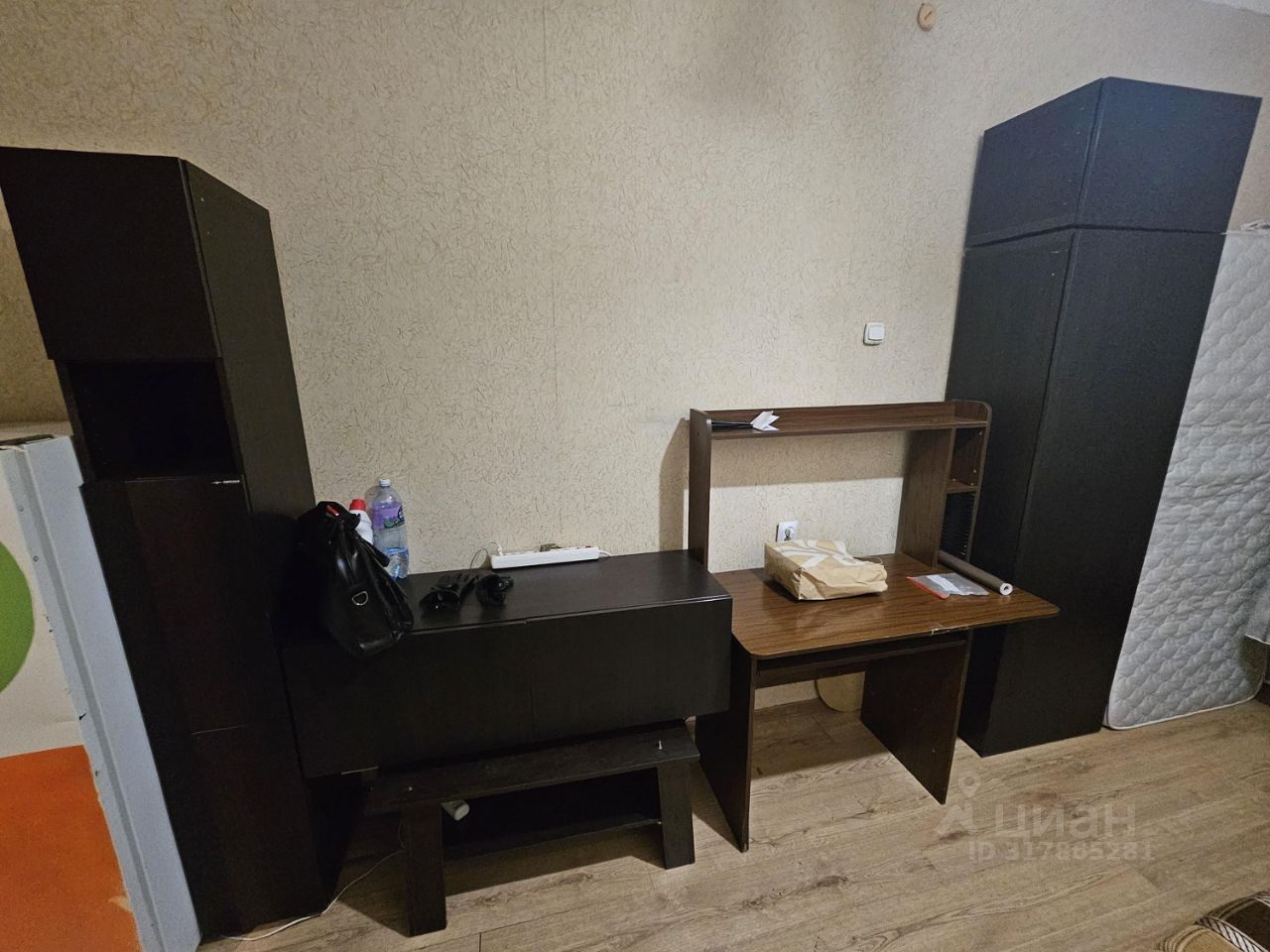 Просторная комната в двухкомнатной квартире. В комнате два шкафа, два стола, двухспальная кровать. Окна выходят во двор.