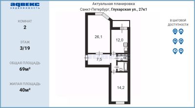 ID: 394219Сдается в аренду двухкомнатная квартира, расположенная в Приморском районе Санкт-Петербурга, по адресу улица Глухарская, дом 27 корпус 1. Ближайшая станция метро — Комендантский проспект, 30 минут пешком, 10 на транспорте, что обеспечивает удобную транспортную доступность.Общая площадь квартиры составляет 69 квадратных метров. Жилая зона представлена двумя изолированными комнатами площадью 26 и 14 кв.м соответственно, а кухня занимает 12 кв.м. Квартира находится на третьем этаже 19-этажного панельного дома, построенного в 2018 году. Высота потолков стандартная, окна выходят во двор.Планировка включает раздельный санузел с душевой нишей вместо ванны. В кухне установлен холодильник, варочная панель, духовка, микроволновая печь, посудомоечная машина, а также есть мебель — диван, стол и стулья. В ванной комнате находятся стиральная машина, полотенцесушитель, гигиенический душ и зеркало. В большей комнате размещён стеллаж и комод, в меньшей — кровать размером 160?200 см, большой шкаф, комод, тумба и телевизор. Интернет подключён.Арендная плата составляет 60 000 рублей в месяц, коммунальные услуги оплачиваются отдельно и колеблются в пределах от 5 000 до 9 000 рублей в месяц. Минимальный срок аренды — 11 месяцев. Для заключения договора требуется залог в размере 60 000 рублей (можно разбить на 2 месяца) и предоплата за первый месяц аренды. Условия предусматривают 50% комиссию агентства. Арендаторам с животными проживание не разрешено, но возможно проживание с детьми с 6 лет.Предоплата за 1 месяцЗалог 60 000 ₽