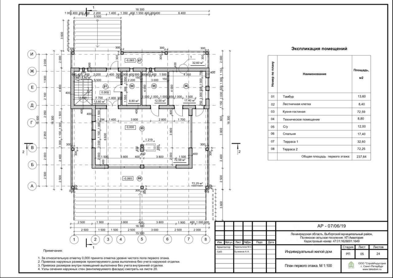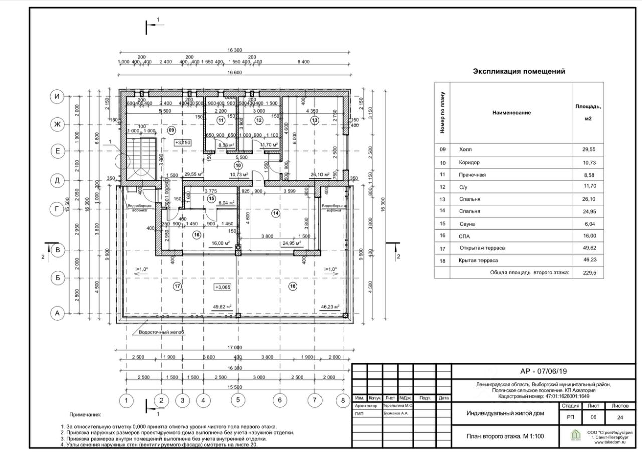 2этажа, размеры 16,3х16,3м, высота 7,1м. Вход в дом осуществляется с небольшой террасы через тамбур. Оттуда имеется доступ к лестнице, с/у и кухне-гостиной, которая объединена в единое пространство, с камином в центре помещения. С зоны гостиной есть вход спальню, а также, непосредственный выход на большую террасу, ориентированную на южную сторону. Общая площадь первого этажа - 237,64м кв. На втором этаже имеется просторный холл, откуда есть доступ в прачечную-с/у, две спальни, помещение СПА с сауной и террасу. Терраса разделена на две части - открытую и с навесом. На террасе предусмотрен уклон 1градус для стока дождевых и талых вод, с водосточным желобом по контуру и двумя водосборными воронками у торцов дома. Также, с террасы второго этажа осуществляется выход на кровлю. Общая площадь второго этажа - 229,5м кв. Вертикальные коммуникации между этажами осуществляются за счет ж/б двухмаршевой лестницы с забежными ступенями. Ширина каждого марша составляет 1000мм, высота подступёнка 175мм, ширина проступи 300мм. Между маршами имеется просвет 100мм. Лестницы у входа на террасы - на металлических косоурах с кобылками, с деревянными ступенями в металлической окантовке и стеклянными ограждениями, высотой 900мм. Кровля плоская неэкспортируемая, с внутренным водостоком. Уклон кровли составляет 1,5%. Две водосточные воронки.