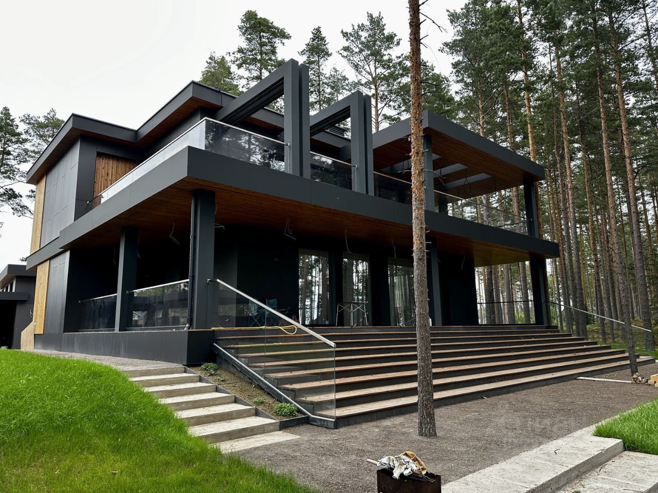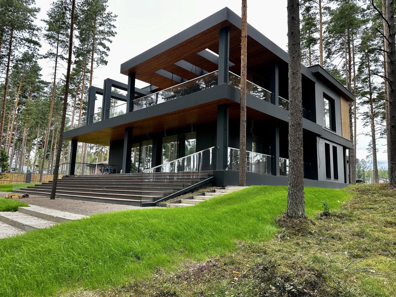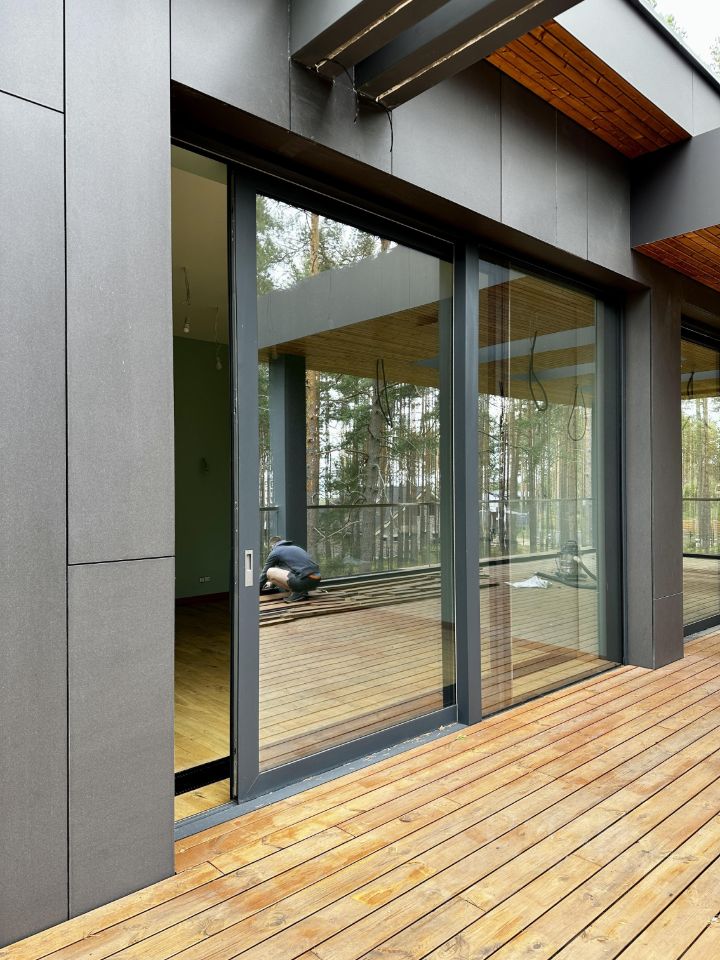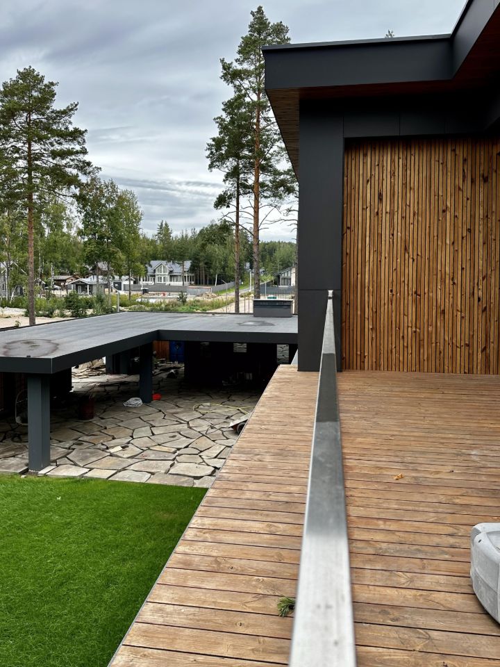Наружные отделочные работы: полы на террасах термодревесина (Termory, Эстония) стены термодревесина (Termory, Эстония)/фиброцементные панели Equiton кровля дома - наплавляемые рулонные материалы крыша террасы на втором этаже - светопропускающие панели ICOPAL FASTLOCK карнизы термодревесина (Termory, Эстония) лестницы у входа на террасы - металлические марши со стеклянными ограждениями и деревянными ступенями в металлической окантовке