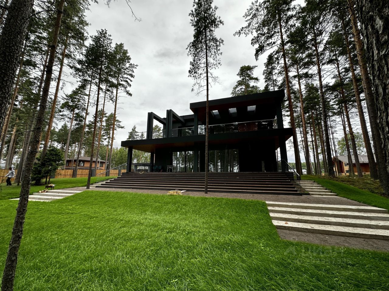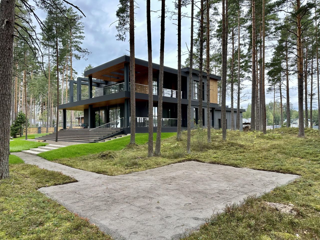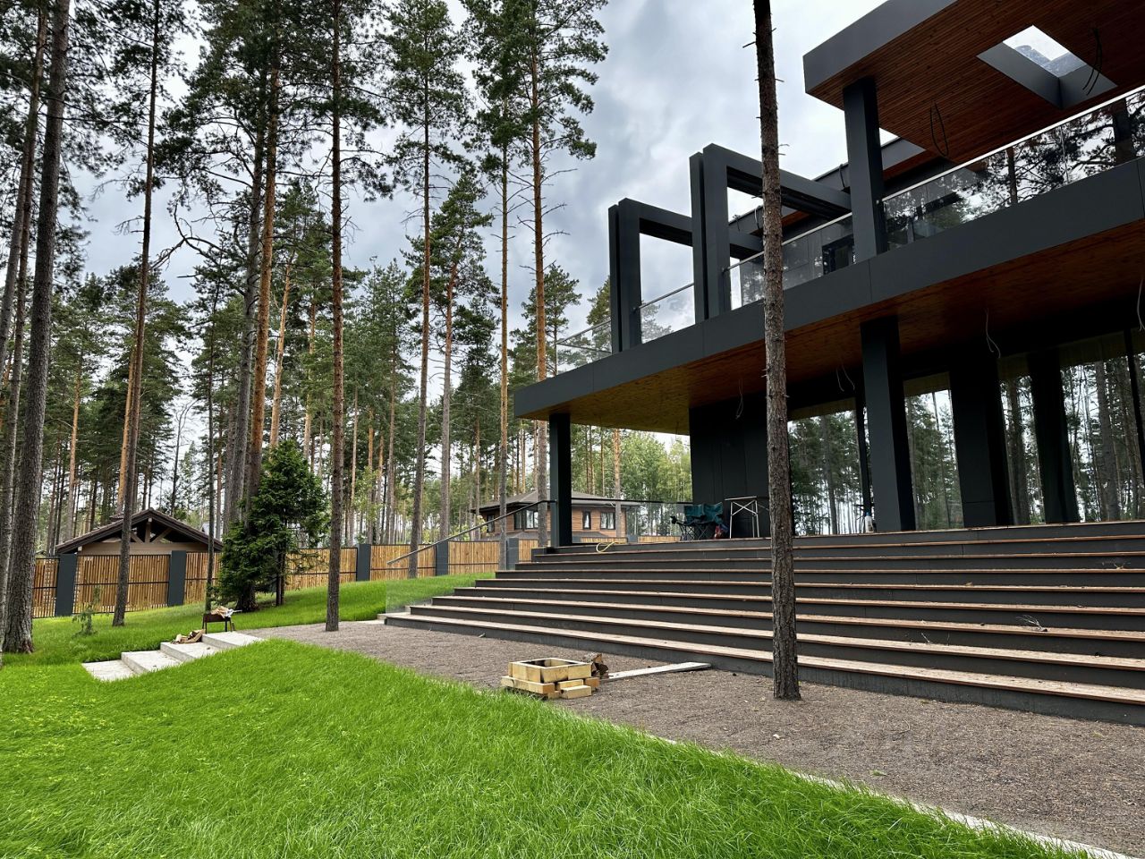 Наружные отделочные работы: полы на террасах термодревесина (Termory, Эстония) стены термодревесина (Termory, Эстония)/фиброцементные панели Equiton кровля дома - наплавляемые рулонные материалы крыша террасы на втором этаже - светопропускающие панели ICOPAL FASTLOCK карнизы термодревесина (Termory, Эстония) лестницы у входа на террасы - металлические марши со стеклянными ограждениями и деревянными ступенями в металлической окантовке