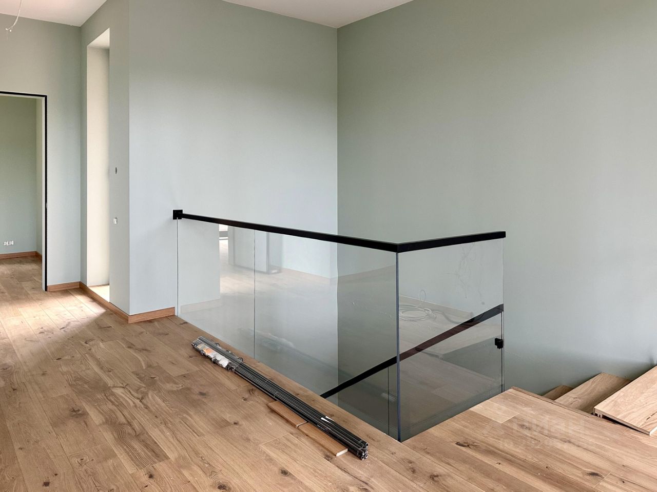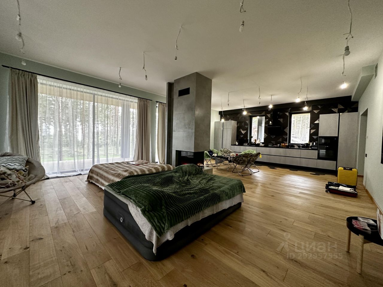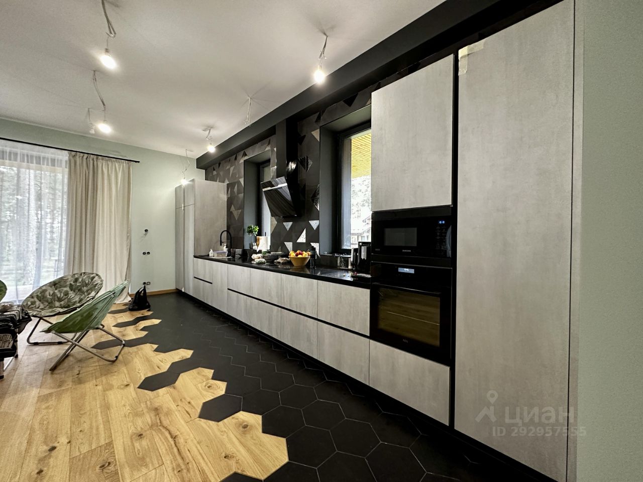 Внутренние отделочные работы: полы паркетная доска (дуб) стены английская краска Little Green окна алюминий (профиль Reynaers), энергосберегающие стеклопакеты с/у керамогранит Italon двери итальянские Sofia (стекло/алюминий) лестница и подоконники дуб ограждения лестницы и душевые кабины стекло/алюминий (индивидуальный заказ) кухня выполнена на заказ, испанские фасады, фурнитура Blum, техника АEG, Samsung, Korting, столешница камень камин трехсторонний (Германия) отопление теплый пол, вдоль всех панорамных окон - встроенные в пол конвектора (Германия) Дом оборудован приточно-вытяжной вентиляцией в каждой комнате, сенсорными выключателями