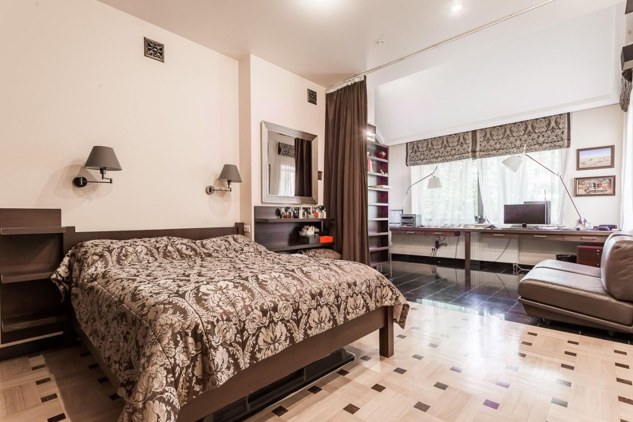 В доме на первом этаже встроенный гараж с антресолью на две машины, котельная с газовым котлом и автоматикой (горячая вода, отопление, полы, радиаторы, полотенцесушители). Эргономика дома позволяет использовать внутренне пространство дома с максимальным комфортом. На первом этаже выделены 3 зоны: просторный зал с камином, кухня, столовая c террасой, спальня с вместительными гардеробными, кабинетом и просторным сан. узлом, хозяйственная комната, сауна, гостевой сан. узел. На втором этаже расположены просторный холл, 3 спальных комнаты, большая игровая комната, совмещенный сан. узел.