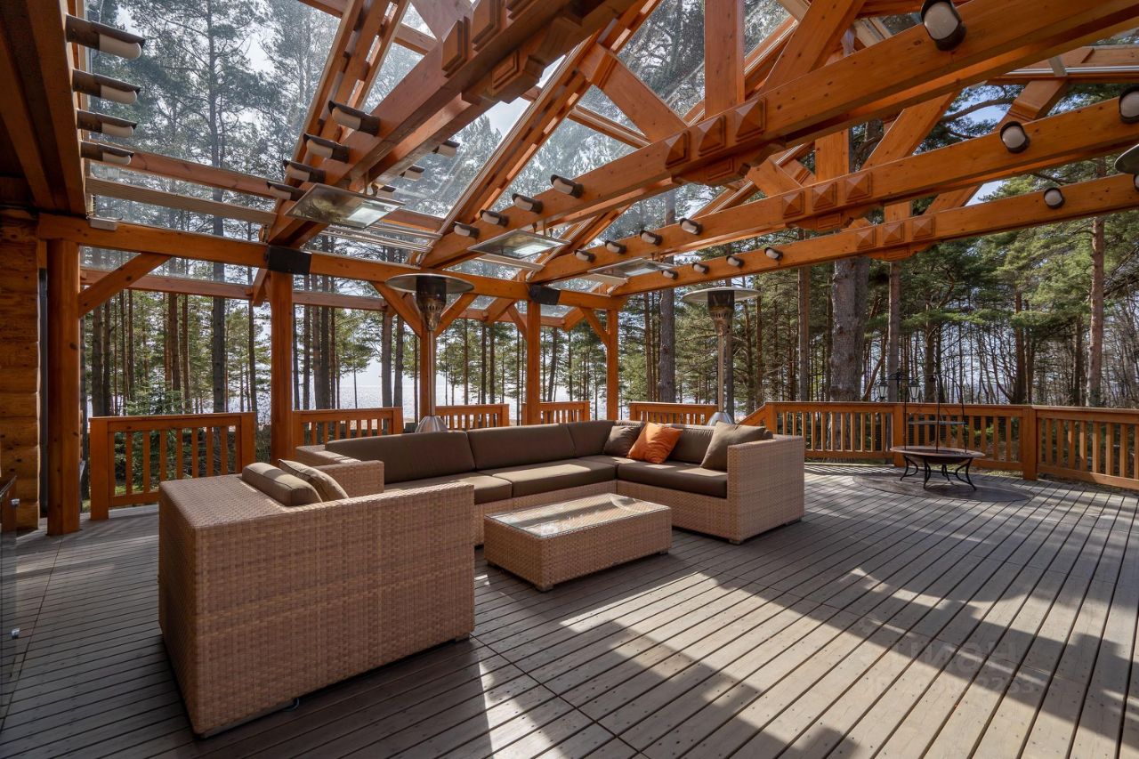 КРЫТАЯ ТЕРРАСА с обеденным столом, мягкой мебелью, системой мультимедиа и профессиональной акустикой. С террасы открывается вид на Финский залив и слышен шум волн.