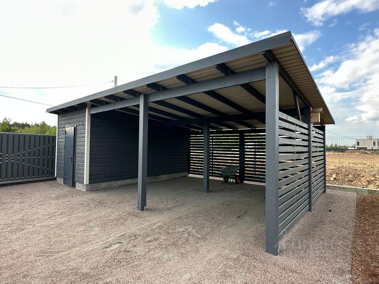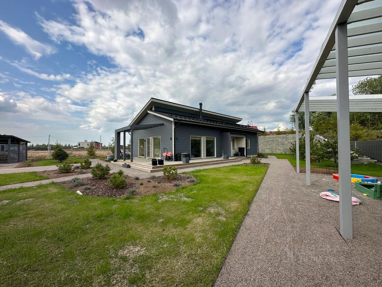 Участок отсыпан и поднят на два метра, сделан дренаж, посажены 10 сосен и 20 елей, сделан ландшафтный дизайн. Имеются дополнительные строения - навес под два машиноместа с хозблоком, летняя кухня, площадью более 100 метров (заготовка под летнюю кухню/баню/купель/детскую зону). Участок, с одной стороны, ограничен подпорной стеной высотой 4 метра, с других сторон - забор (дерево-сталь). Ворота откатные с электроприводом.