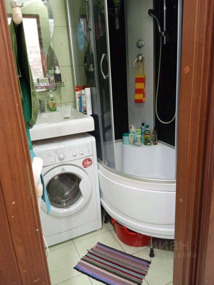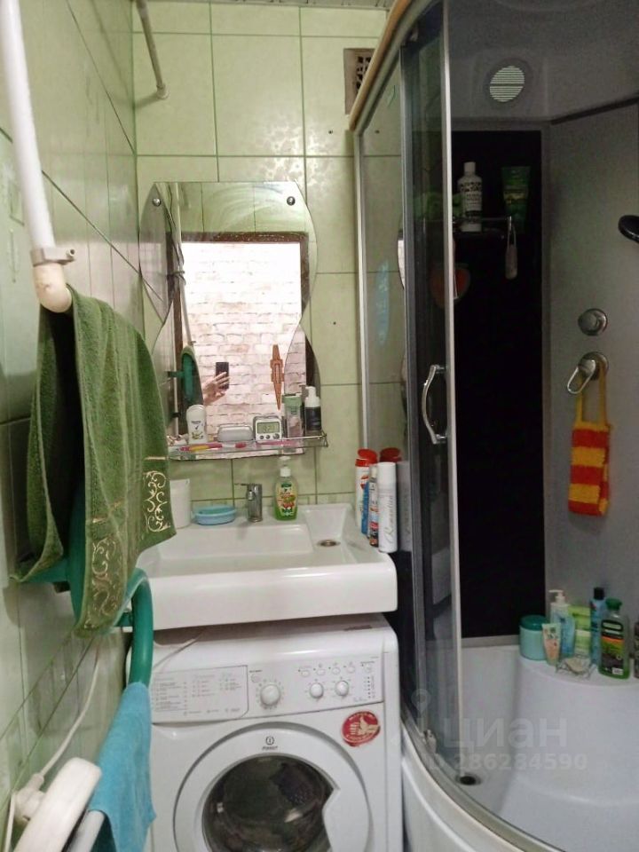 В ванной комнате: плитка, новая душевая кабинка, квадратная раковина.