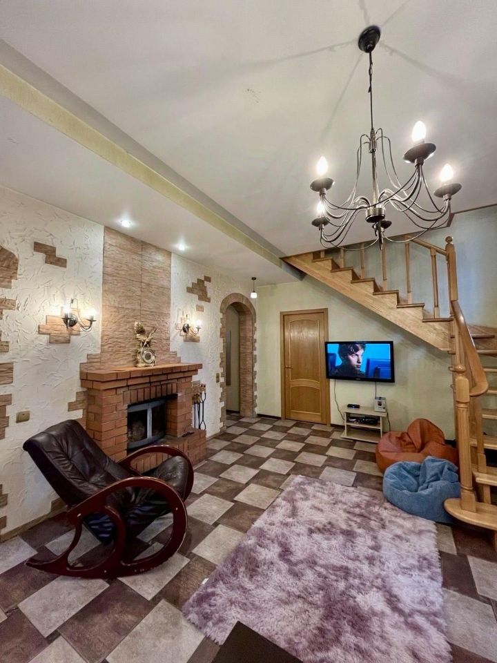 1 этаж: санузел, горячая и холодная вода в доме, кухня-гостиная, 1 комната, есть вся необходимая техника и посуда, стол, стулья, камин, телевизор, диван. Также на 1-ом этаже располагается банный комплекс (по согласованию), в который входит бассейн, купель, сауна и душевая. 2 этаж: 3 спальных комнаты, можно разместить до 6-7 человек.