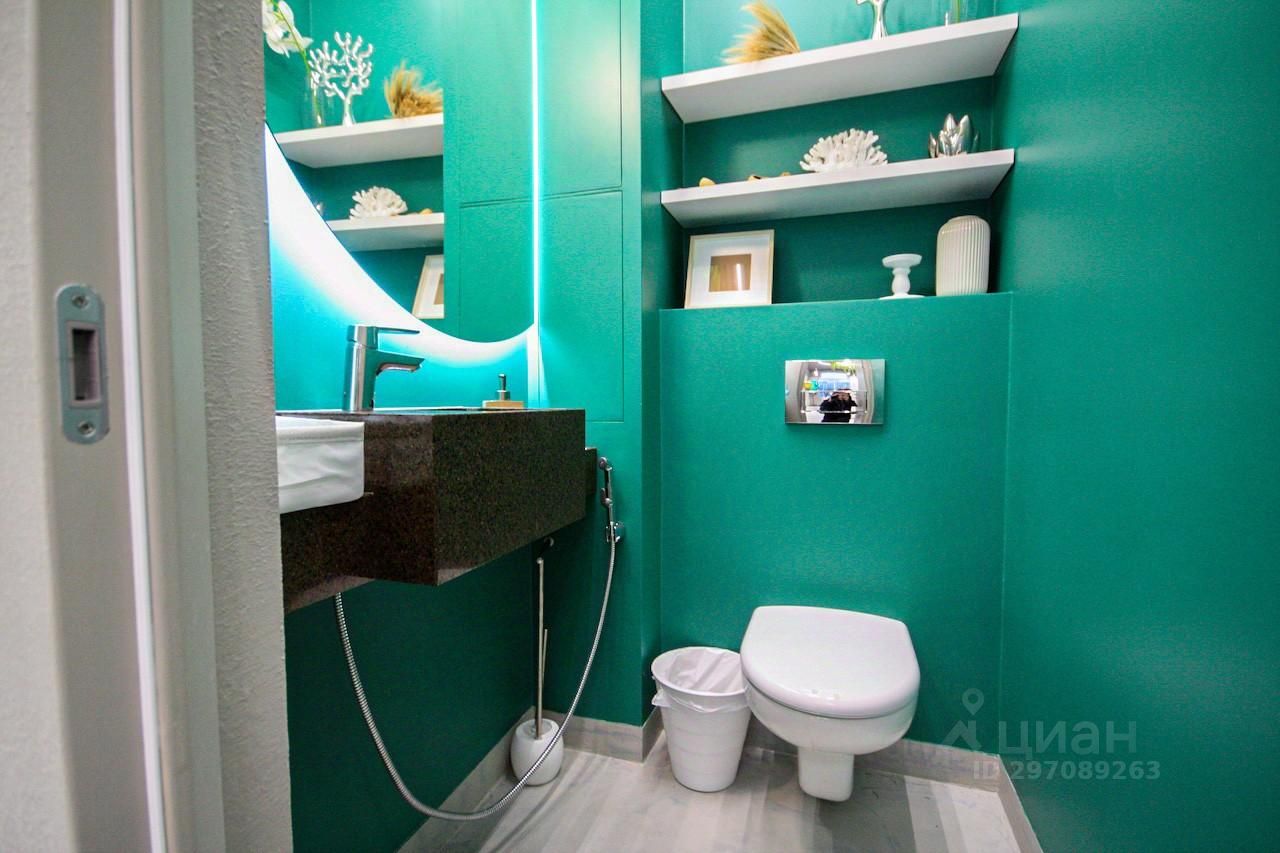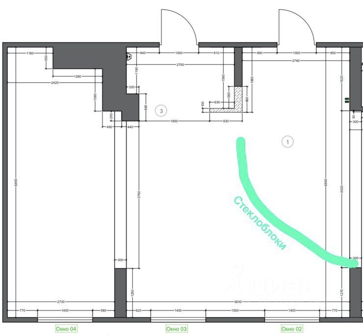 - Оборудованный санузел. Помещение разделено стеной из стеклоблоков.