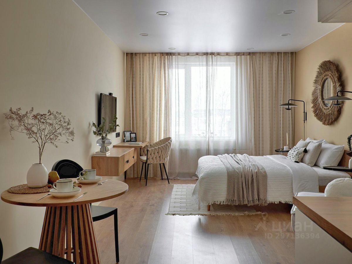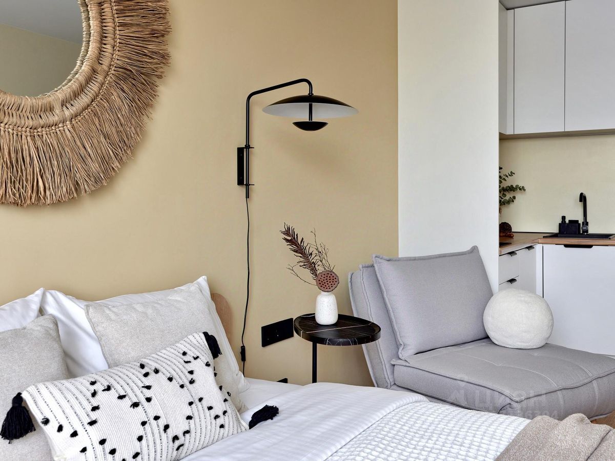 Об апартаменте: • Площадь — 28,5 м² • Новый дизайнерский ремонт, выполненный в светлых и уютных тонах • Полностью меблирована и оборудована всем необходимым для комфортного проживания Планировка: — Просторная двуспальная кровать с ортопедическим матрасом — Кресло-кровать (дополнительное спальное место) — Рабочая зона с письменным столом — Кухонная зона с обеденным столом — Телевизор, Wi-Fi, кондиционер Техника и оснащение: — Варочная панель, холодильник, микроволновка — Посудомоечная машина — Стиральная + сушильная машина — Электрический полотенцесушитель, фен — Большой встроенный шкаф