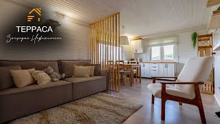 Планировка: 1 этаж - уютная кухня-гостиная, крытая терраса с мягким диваном и подвесными качелями, жаркая баня, с/у, прихожая.