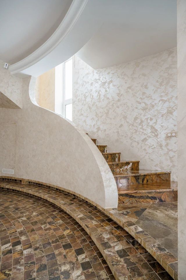 Весь дом отремонтирован с применением дизайн-проекта в современном стиле, используя только натуральные материалы. Отдельное внимание заслуживает удобная лестница на второй этаж , отделанная натуральным камнем.