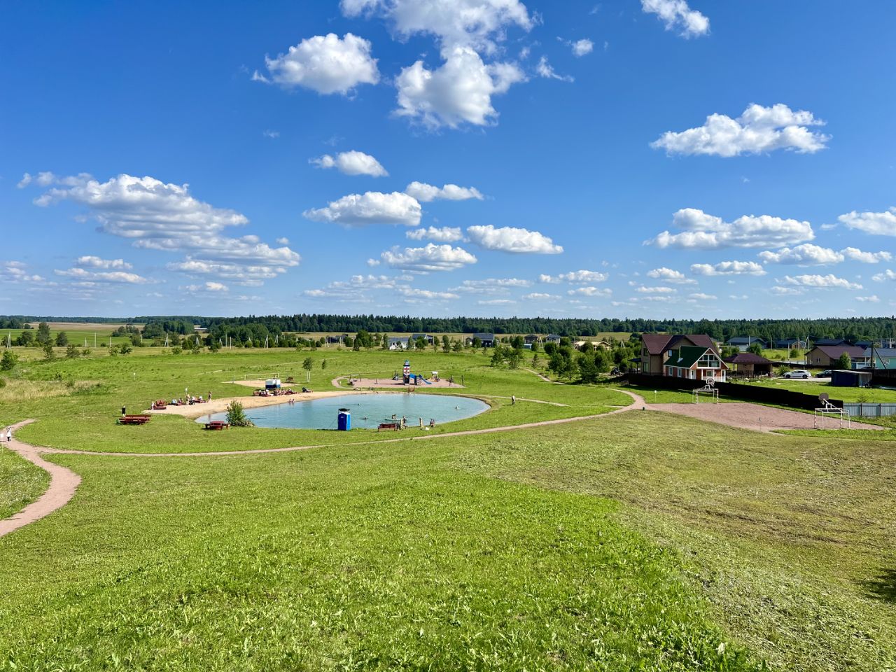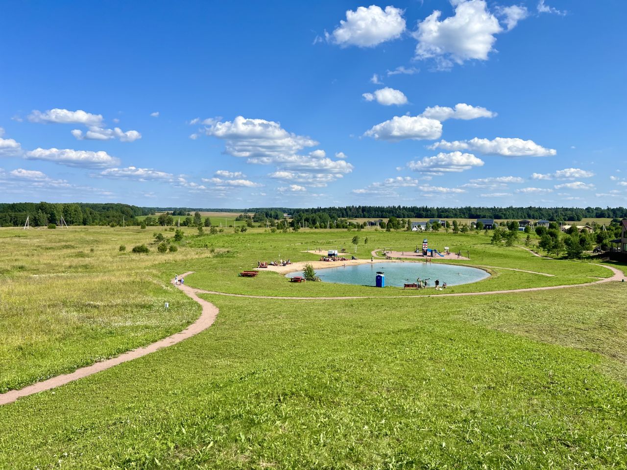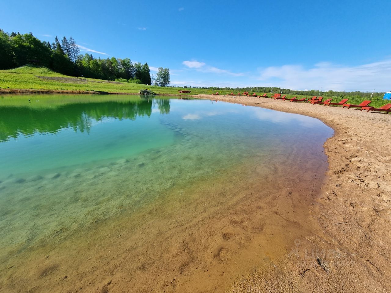 благоустроенное озеро с песчаным пляжем.