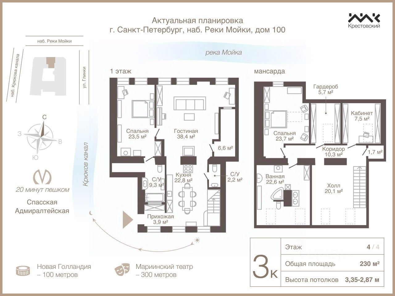 Арт. 60719580 Двухэтажная атмосферная квартира на набережной Мойки! В стоиость квартиры входит вся мебель и техника. Планировка Квартира занимает 4 и 5 этажи в доме 100 на набережной реки Мойки. На площади в 230 м² реализована удобная планировка, в которую входят: Подробнее расскажем про ремонт и наполнение: Ремонт и отделка Недвижимость прошла капитальное обновление: в квартире и парадной полностью заменили перекрытия и коммуникации, за состоянием инженерных коммуникаций дома ответственно следит эксплуатационная служба. Магия дома и места Доходный дом Фитингофа, построенный в стиле итальянского ренессанса, по праву считается выдающимся памятником городской застройки. Арочные окна, ярусная система пилястр, филенчатая структура стен привлекают внимание и подчеркивают статусность недвижимости. Фасады здания обращены на набережную Мойки, набережную Крюкова канала и улицу Глинки. В шаговой доступности располагаются многочисленные исторические и культурные достопримечательности города: Мариинский театр, Новая Голландия, Поцелуев Мост. Квартира в историческом центре идеально подойдет для проживания семьи. Звоните и приезжайте на просмотр, подобные предложения в данной локации — редкость. Приглашаю к сотрудничеству агентов за достойное вознаграждение.