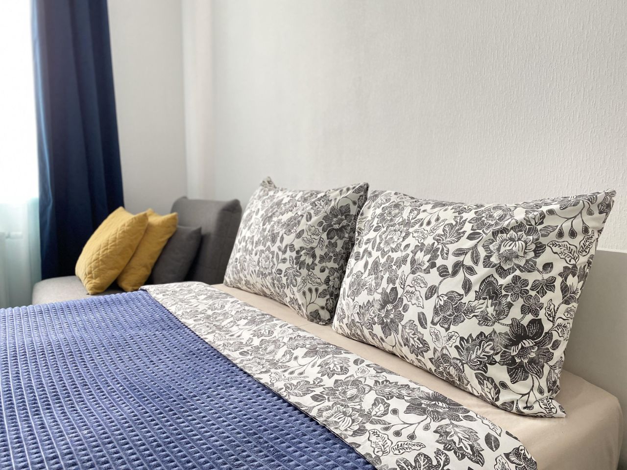 В спальне двуспальная кровать, в гостиной два дивана икеа(2+2).