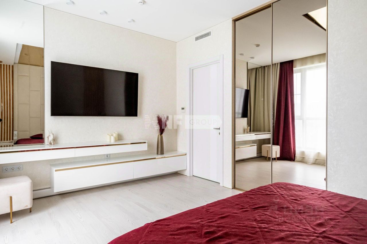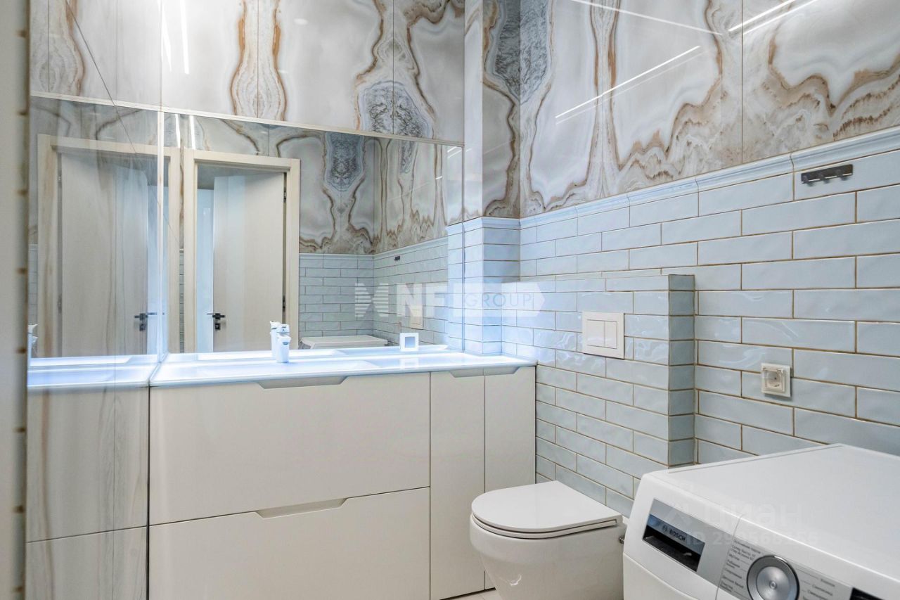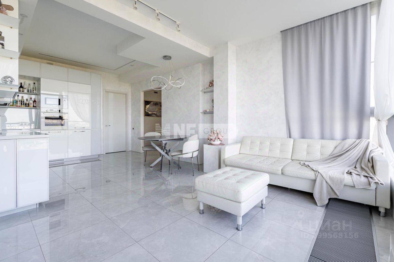 В резиденции можно разместить две просторные спальни, или спальню + кабинет/вторая гостиная Просторная кухня-гостиная площадью 25 кв.м. с панорамными окнами. Из окон гостиной открывается вид на воду. Два санузла.