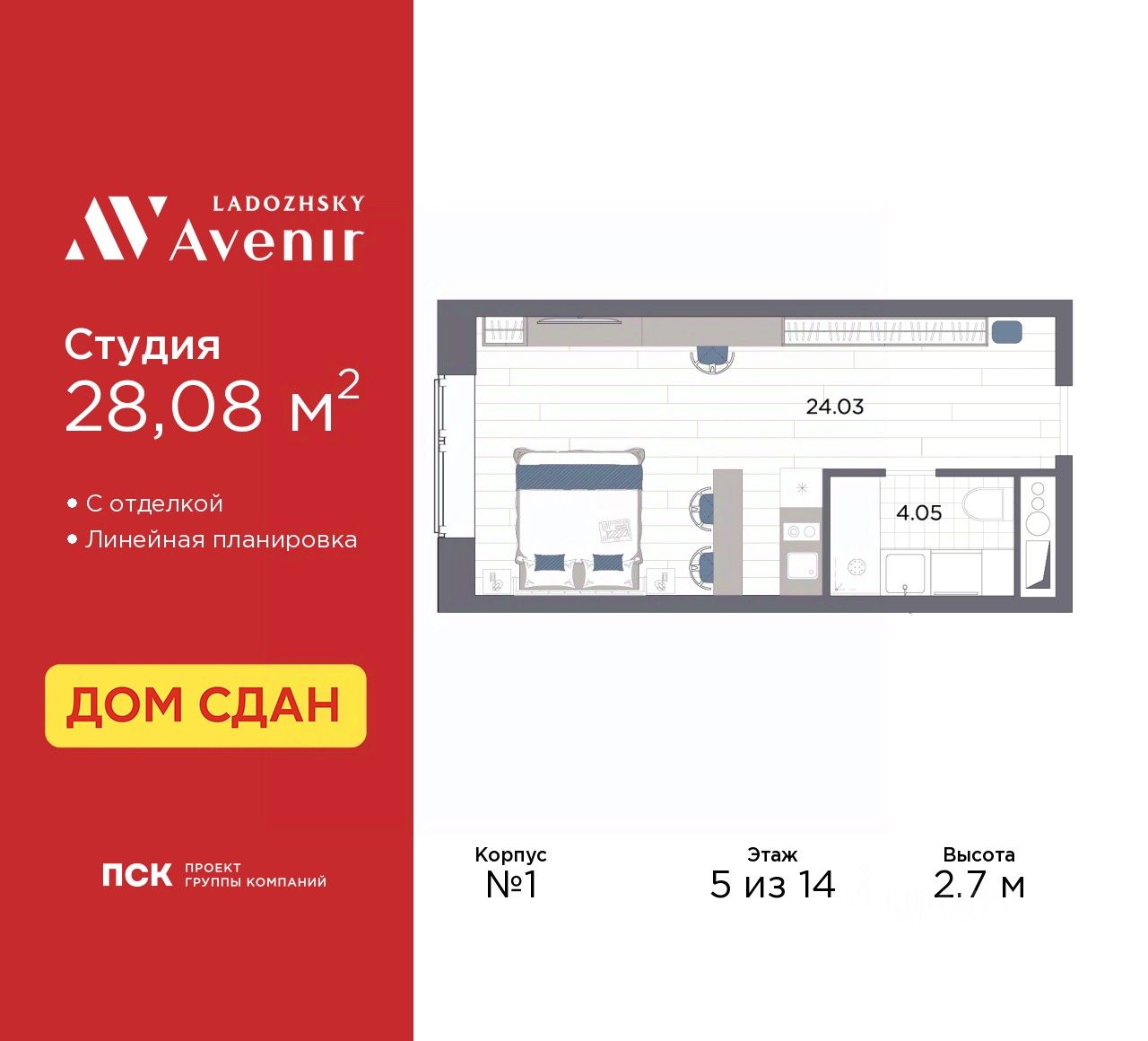 Однокомнатные апартаменты-студия от застройщика с отделкой в ЖК ''Ladozhsky AVENIR'' на 5 этаже. Общая площадь: 28.08 кв.м., площадь гостиной 24.03 кв.м., из которых 5 кв.м. выделено под кухонную зону. Все окна выходят на одну сторону. В апартаментах один совмещенный санузел. Высота потолков 2.7 м.