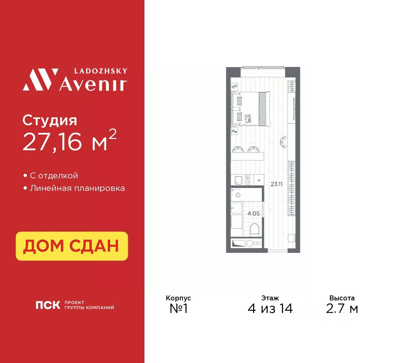 Просторные однокомнатные апартаменты-студия с отделкой в ЖК ''Ladozhsky AVENIR'' на 4 этаже. Общая площадь: 27.16 кв.м., площадь гостиной 23.11 кв.м., из которых 5 кв.м. выделено под кухонную зону. Все окна выходят на одну сторону. В апартаментах один совмещенный санузел. Высота потолков 2.7 м.