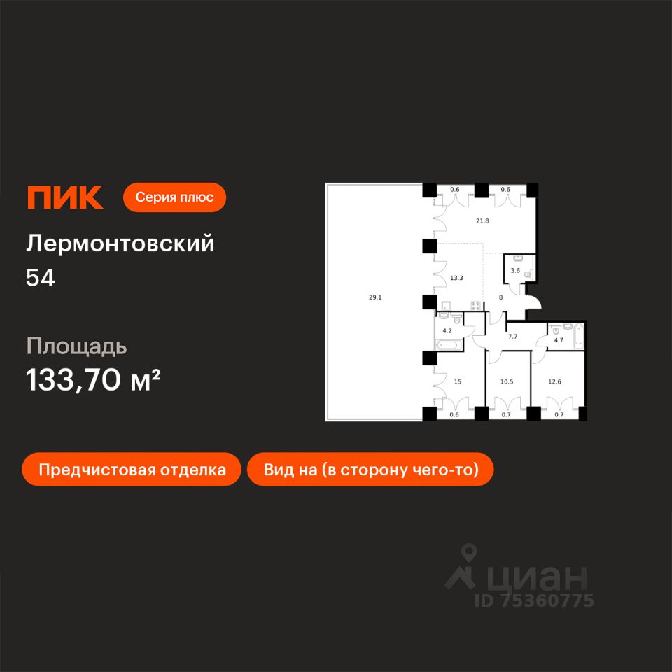 Продаётся 3-комн. квартира площадью 133,7 кв.м на 8 этаже 9 этажного дома (Корпус 1, Секция 6) проекта ПИК Лермонтовский 54. Светлый просторный подъезд на уровне земли, функциональная планировка, большие окна, предчистовая отделка.