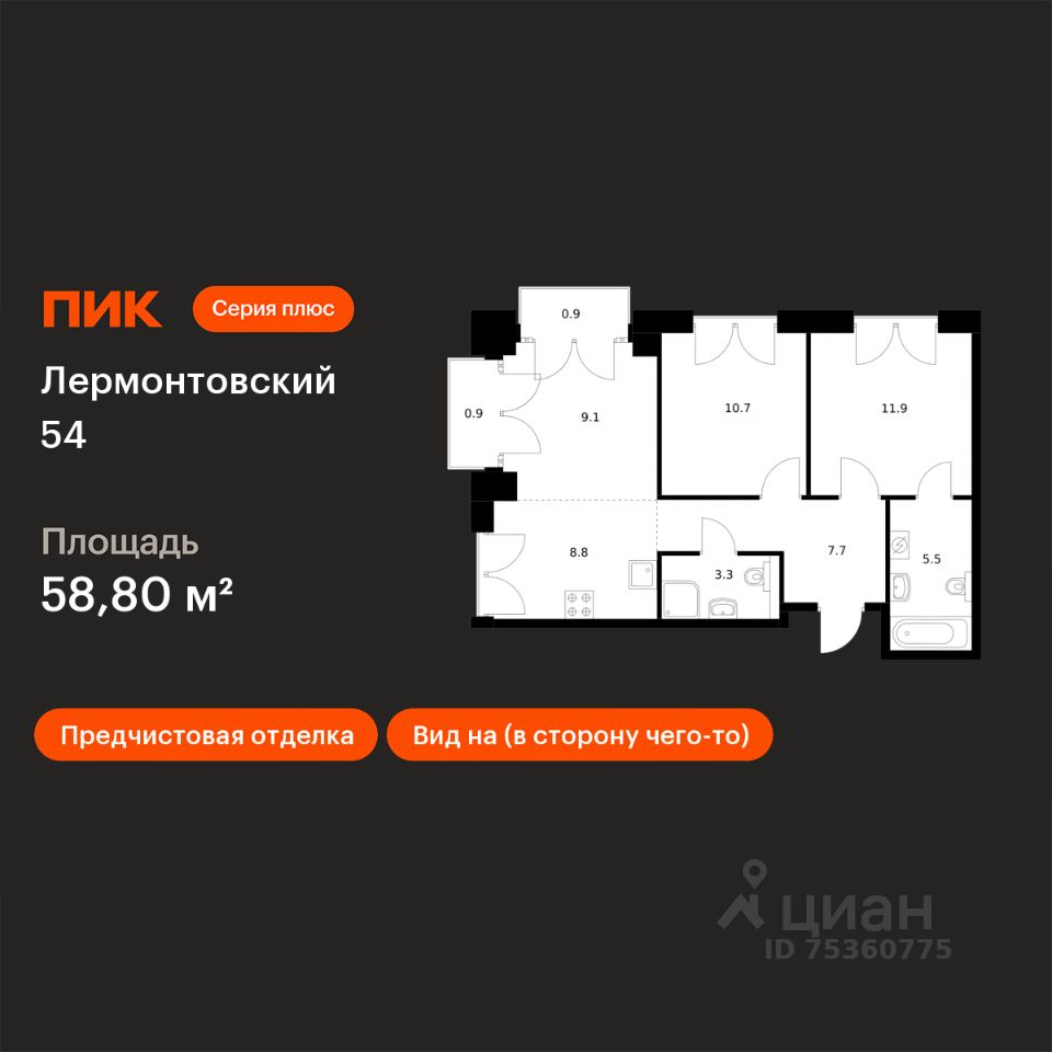 Продаётся 2-комн. квартира площадью 58,8 кв.м на 4 этаже 7 этажного дома (Корпус 1, Секция 7) проекта ПИК Лермонтовский 54. Светлый просторный подъезд на уровне земли, функциональная планировка, большие окна, предчистовая отделка.