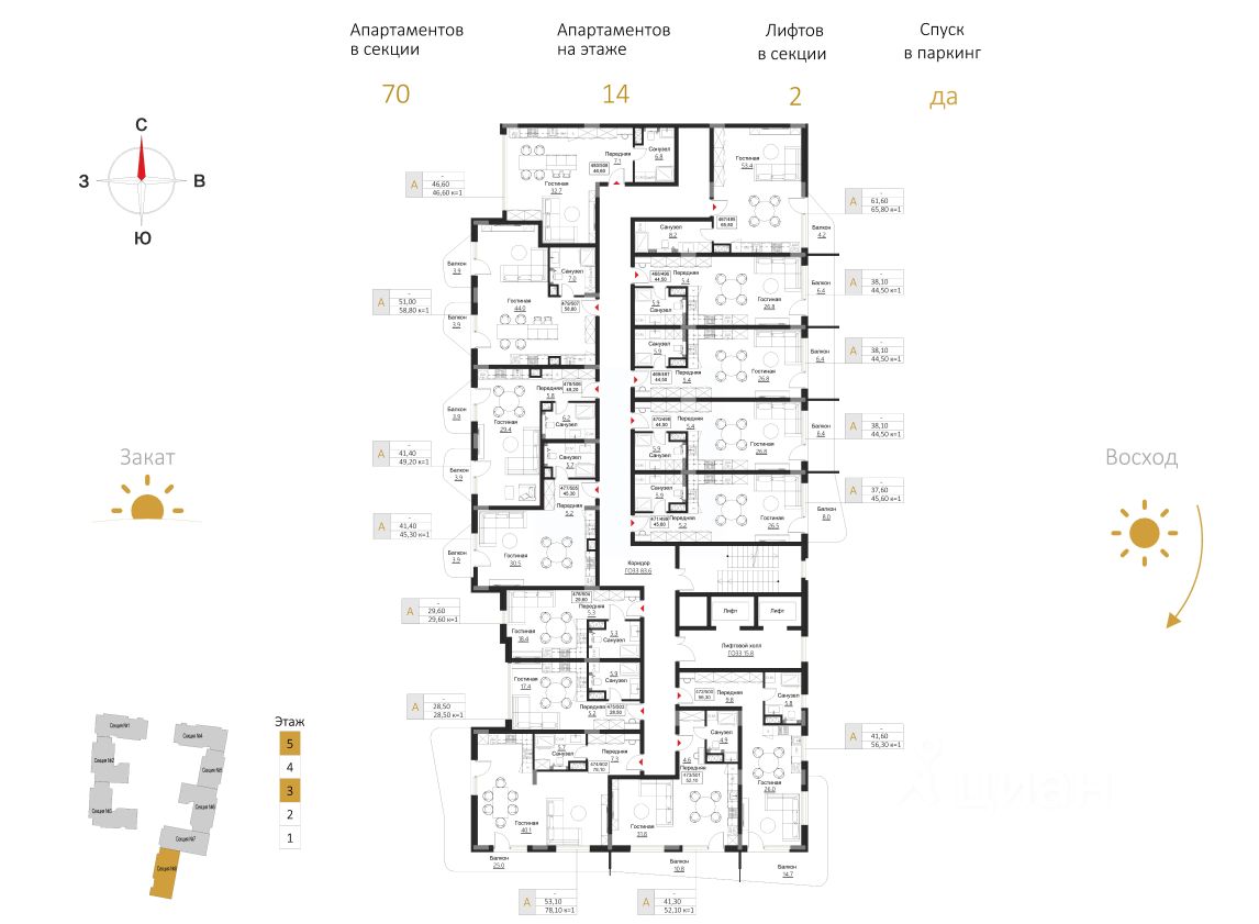 Комплекс состоит из восьми корпусов с различными вариантами планировочных решений от студий площадью 28,5 м2 до апартаментов площадью 82,1 м2 с открытыми террасами. Высота потолков - 3 м. Предусмотрен подземный паркинг на 286 мест.