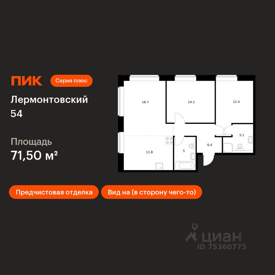 Продаётся 2-комн. квартира площадью 71,5 кв.м на 1 этаже 9 этажного дома (Корпус 1, Секция 3) проекта ПИК Лермонтовский 54. Светлый просторный подъезд на уровне земли, функциональная планировка, большие окна, предчистовая отделка.
