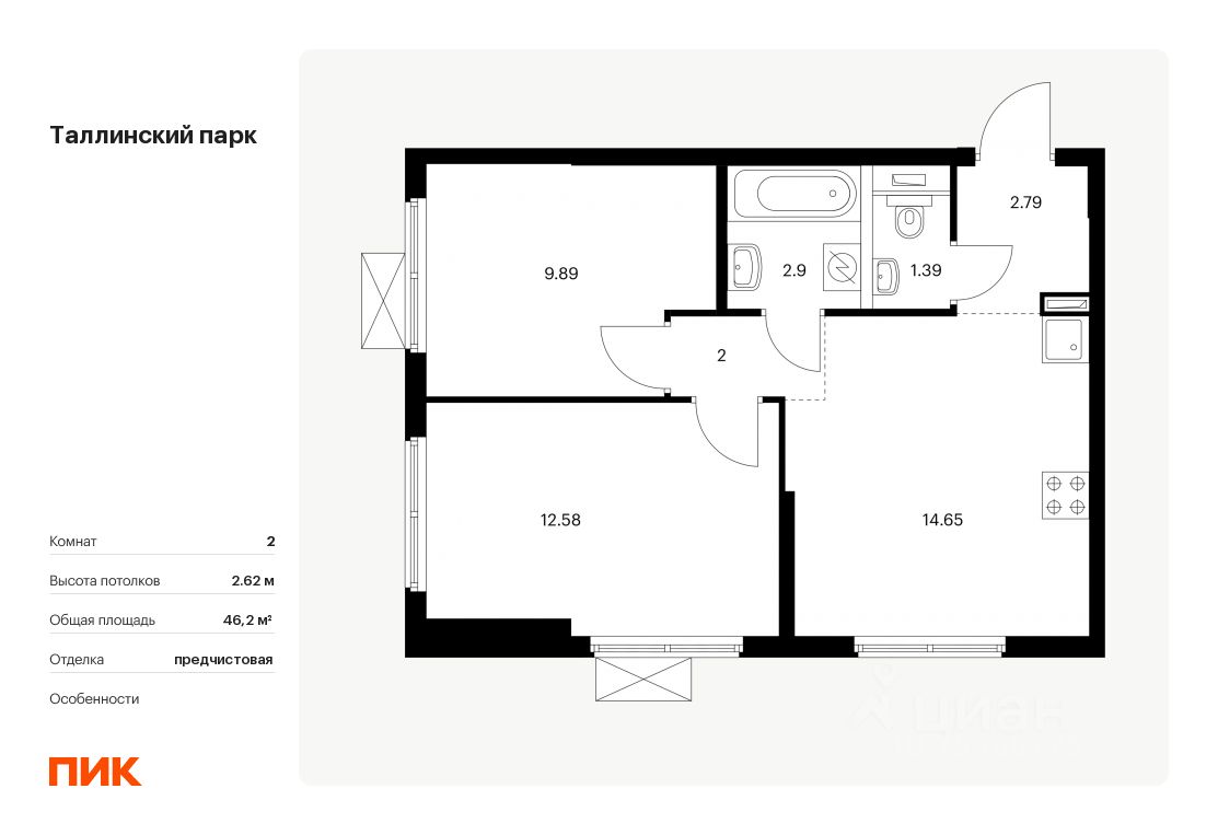 Продаётся 2-комн. квартира площадью 46,2 кв.м на 8 этаже 12 этажного дома (Корпус 3.3, Секция 1) проекта ПИК Таллинский парк. Светлый просторный подъезд на уровне земли, функциональная планировка, большие окна, предчистовая отделка.