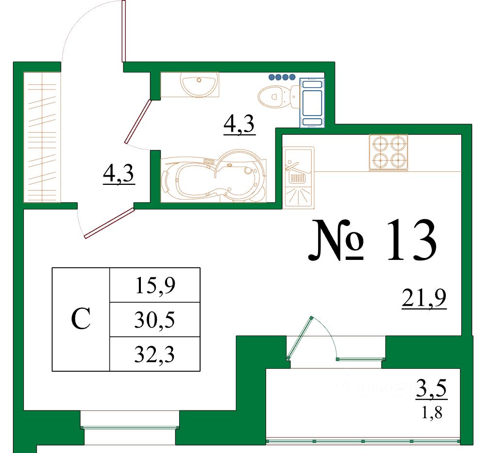 Общая площадь32,3 м2
